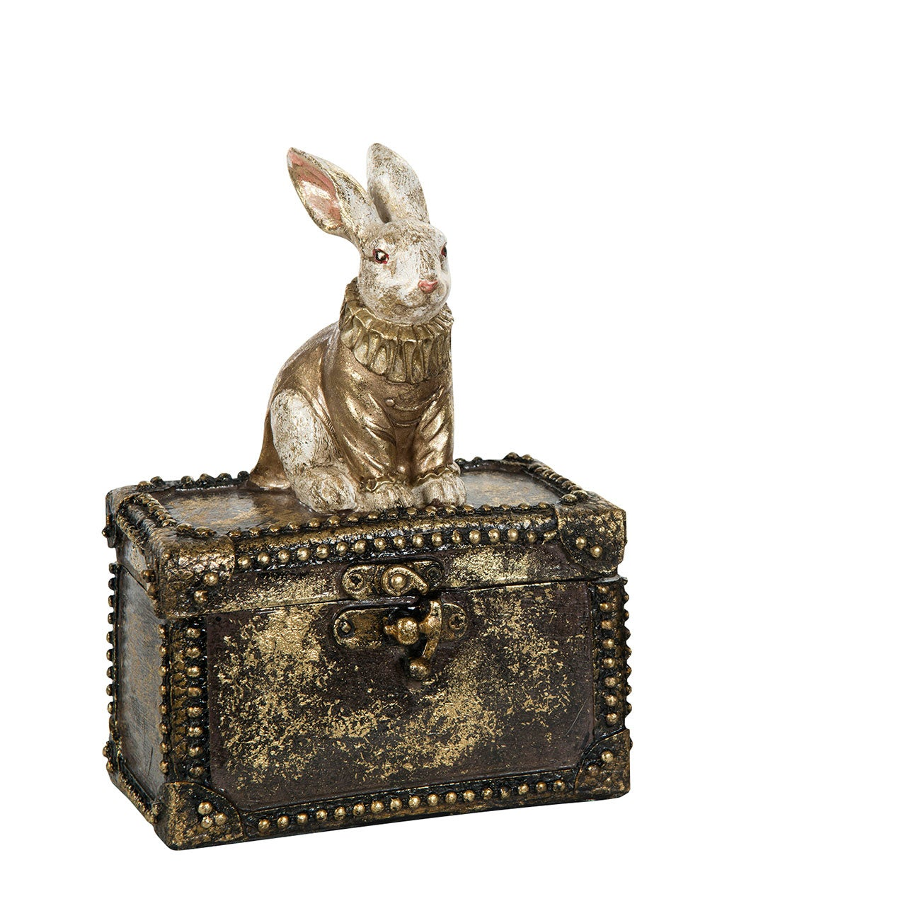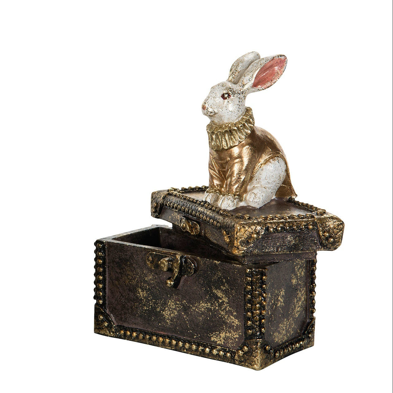 Soma pääsiäispupu istuu säilytysrasian päällä vaaleanpunaisessa takissaan. Pääsiäisen pöytäkoriste, jonka sisällä säilytät pääsiäisnamuja.