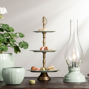 Vihreä kolmitasoinen kerrosvati on paitsi käytännöllinen tilansäästäjä juhlapöydässä myös komea juhlapöydän koriste. Kerrosvati on koottava ja menee siis pieneen säilytystilaan tarpeen vaatiessa. Vatien määrä on säädettävissä. Voit lisätä tai vähentää niitä tarvittaessa. Emalipintainen tarjoiluastia on helppo pitää puhtaana. Vadeissa on uurretut koristeelliset reunat. Kerrosvadin jalka on elegantisti muotoiltu ja kaunista messingin väristä metallia. Kerrosvatia on helppo kantaa sen nupissa olevasta rengaskiinnikkeestä.