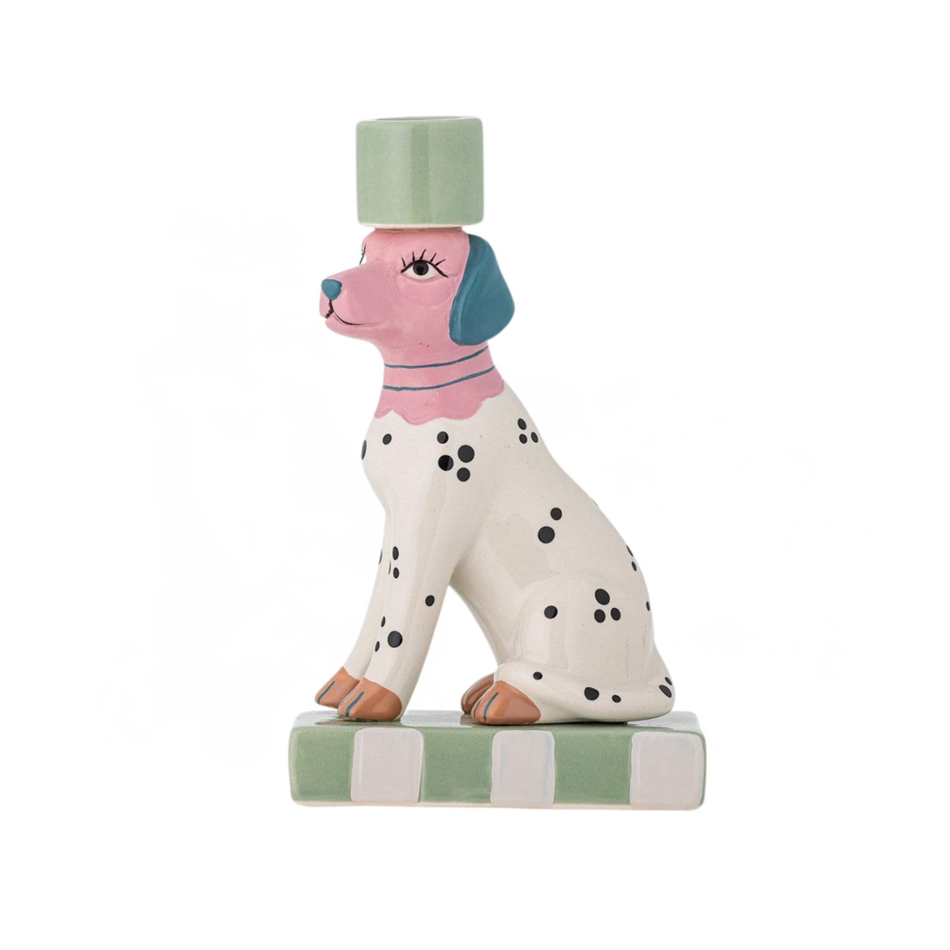 Leikkisä keraaminen kynttilänjalka, joka esittää raidallista koiraa pyjama-asussa, on ihastuttava väripilkku ja hyvän mielen pöytäkoriste vaikka ilman kynttilää.
