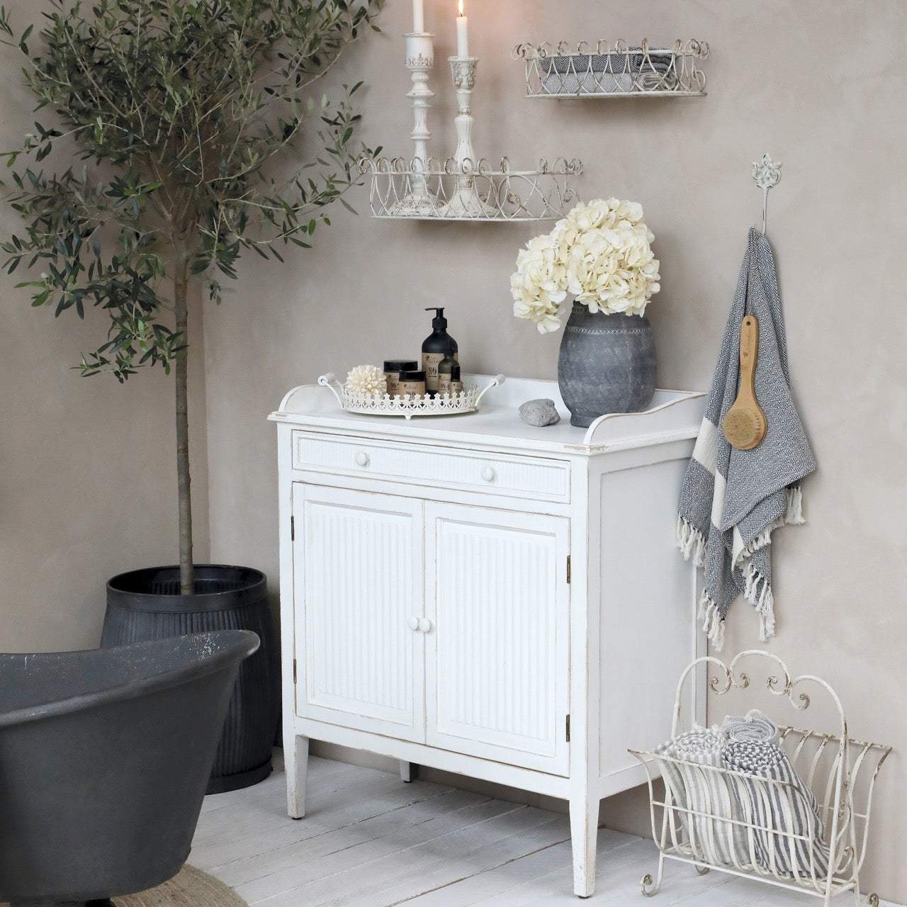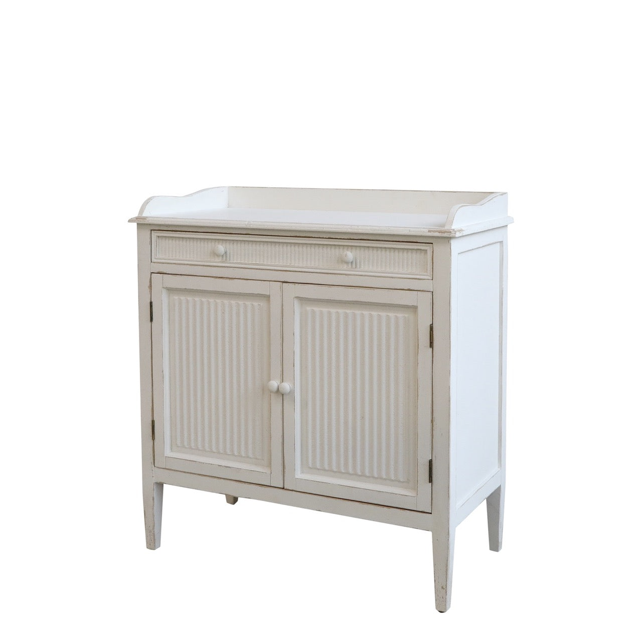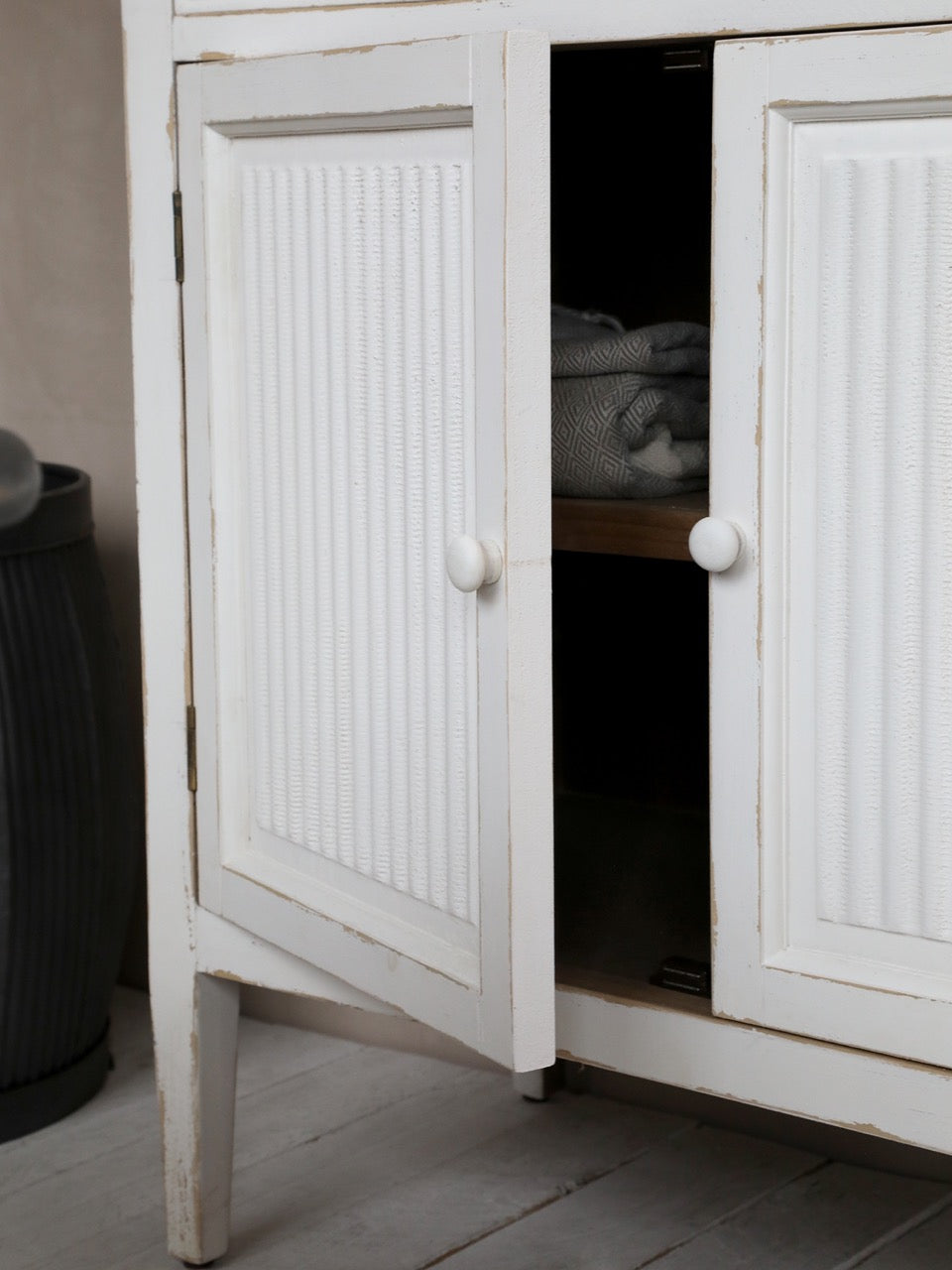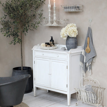 Maalaisromanttinen kuusipuusta valmistettu senkki on käsitelty antiikkivalkoiseksi.
