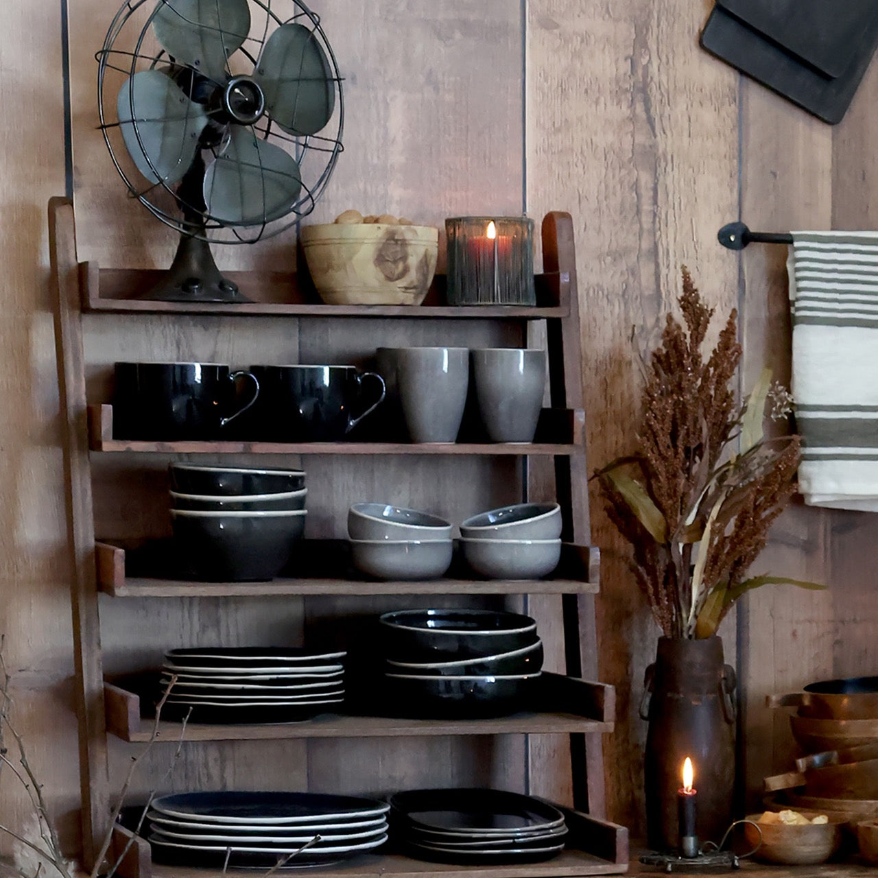 Kierrätyspuinen hyllykkö voidaan asentaa seinälle tai asettaa pöytätason päälle.