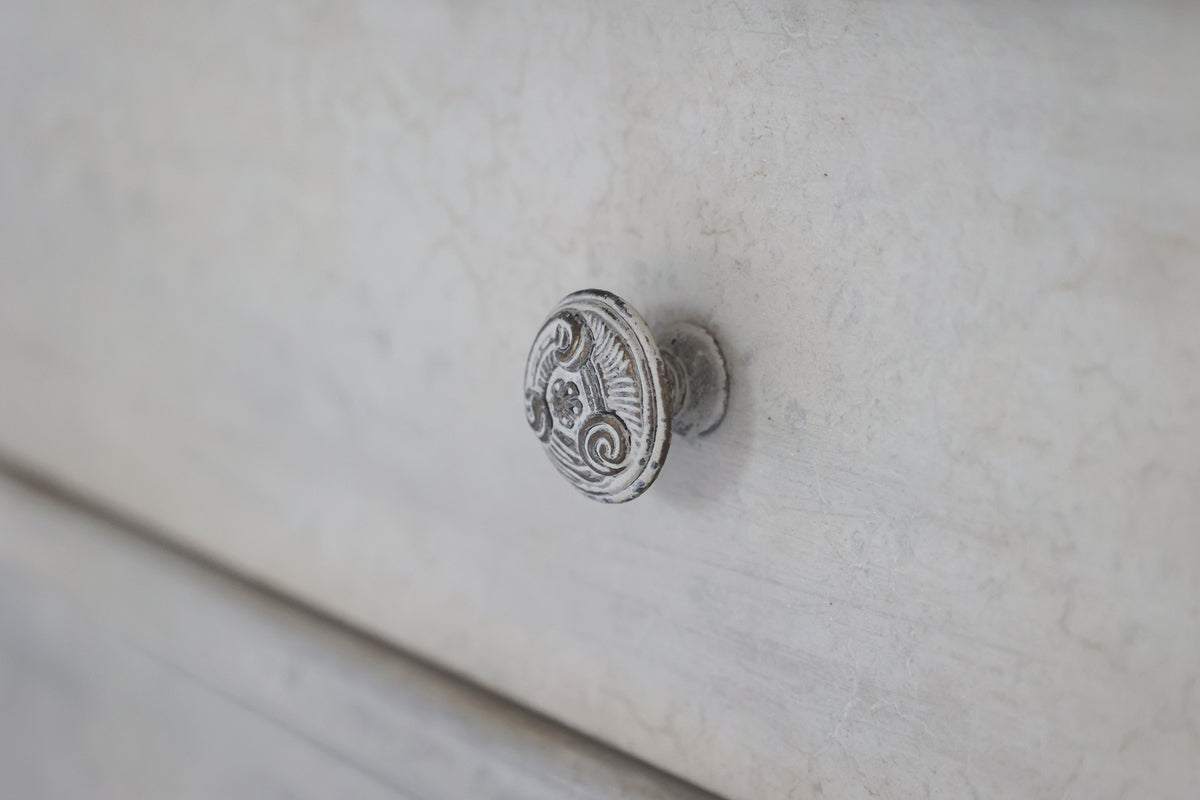 Männystä valmistettu valkoinen antiikkikäsitelty senkki maalaisromanttiseen sisustamiseen.