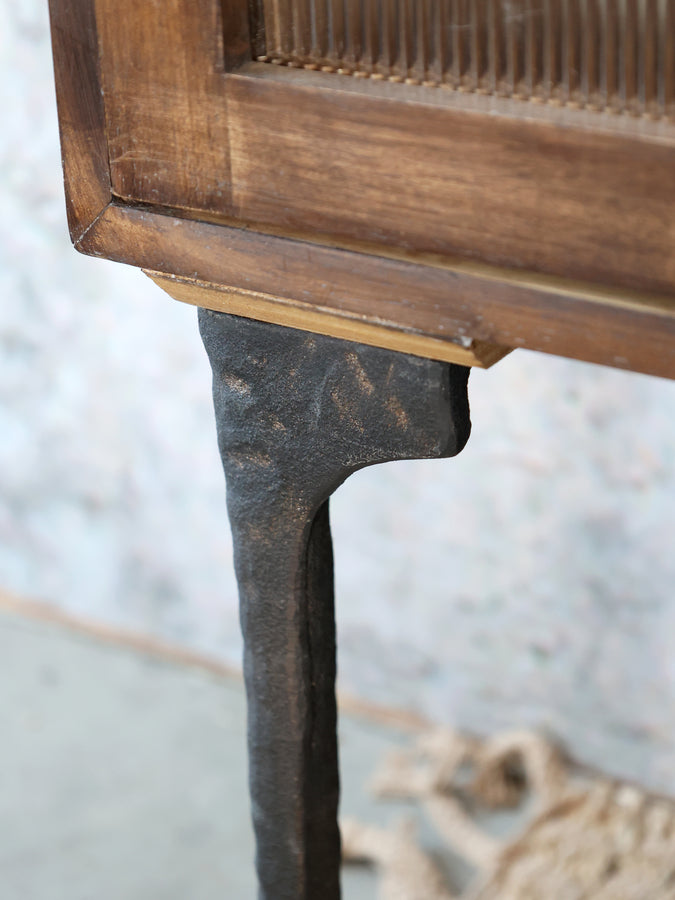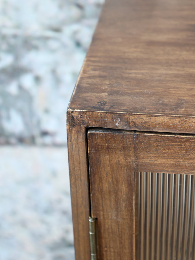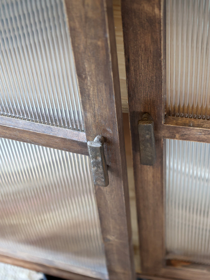 Kumipuusta ja männystä valmistettu vaaleanruskea senkki sopii esimerkiksi astiakaapiksi, kirjahyllyksi tai eteisen kaapiksi.