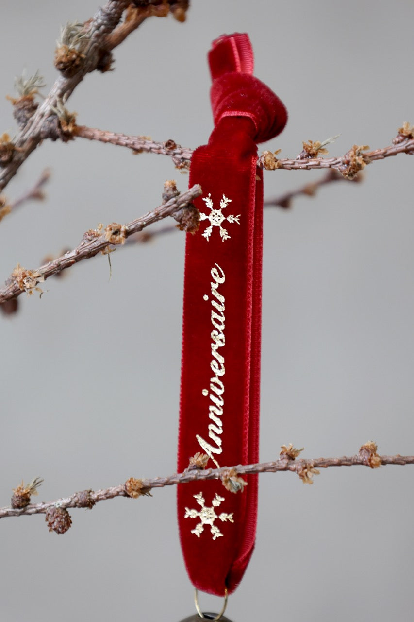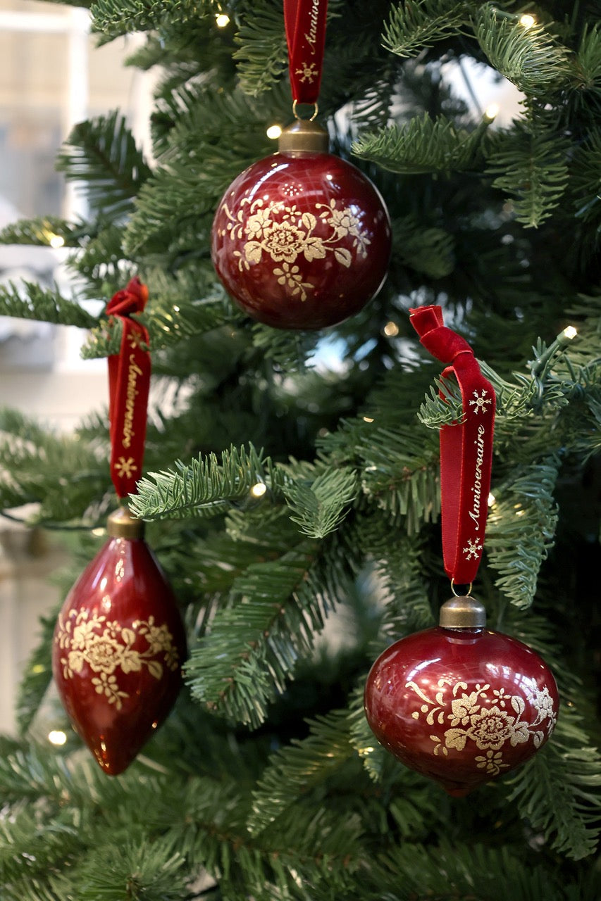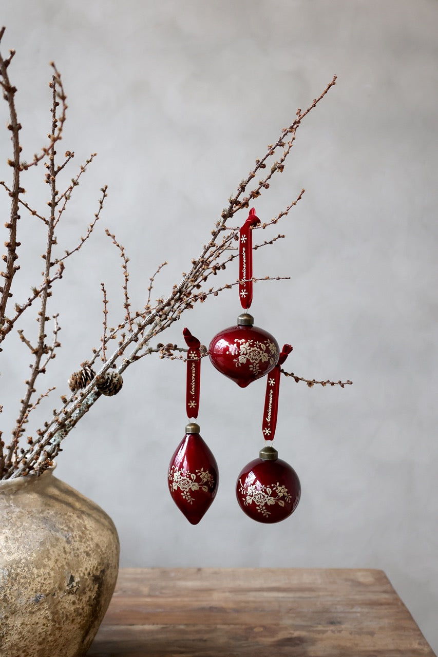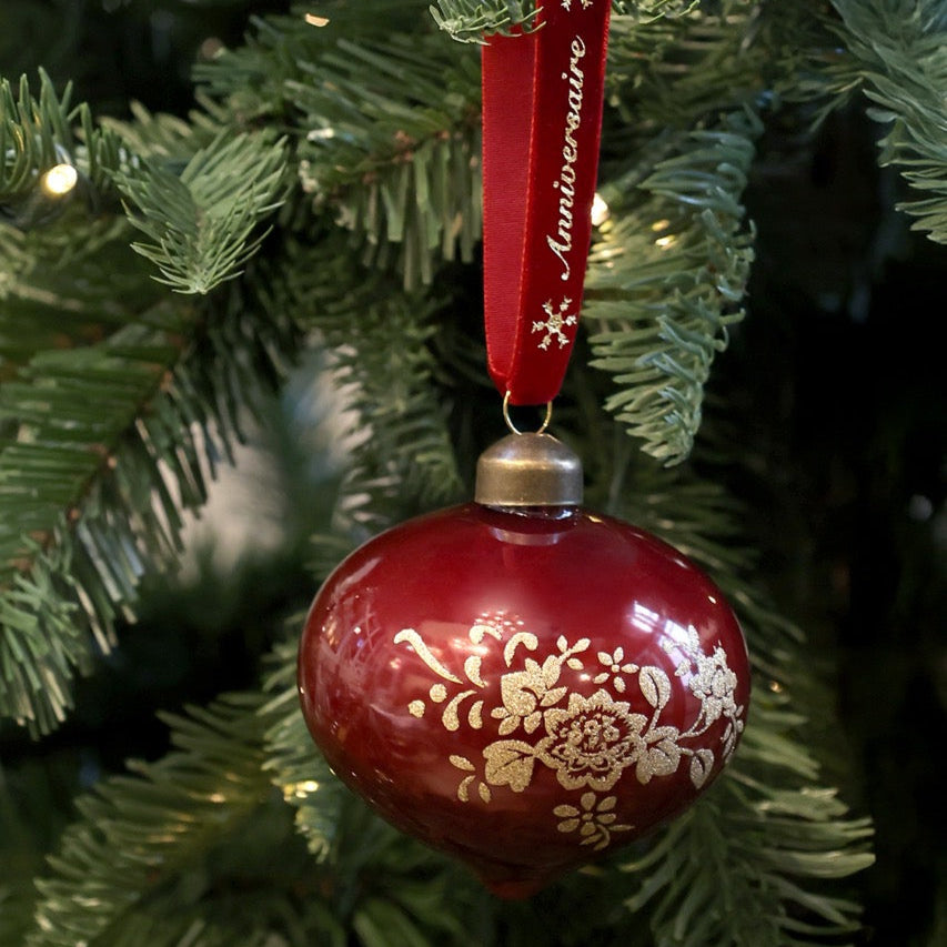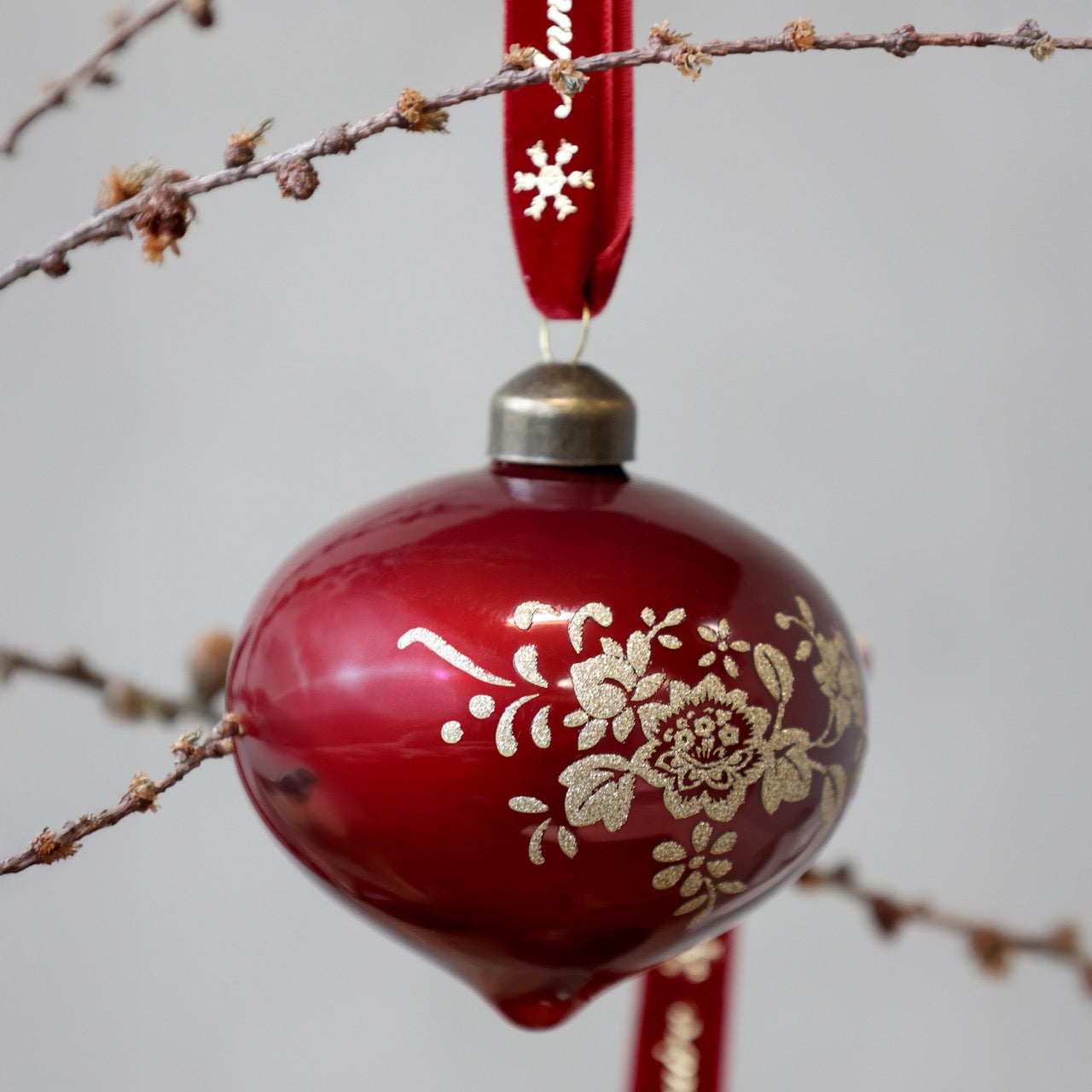 Tyylikäs kirsikanpunainen lasinen joulupallo on koristeltu kauniilla kullansävyisellä kukkaornamenttikuvioinnilla. Ihastuttava sipulinmuotoinen joulukuusenkoriste, jota voit käyttää myös ikkunakoristeena. Joulupallossa on koristeltu samettinen nauha.