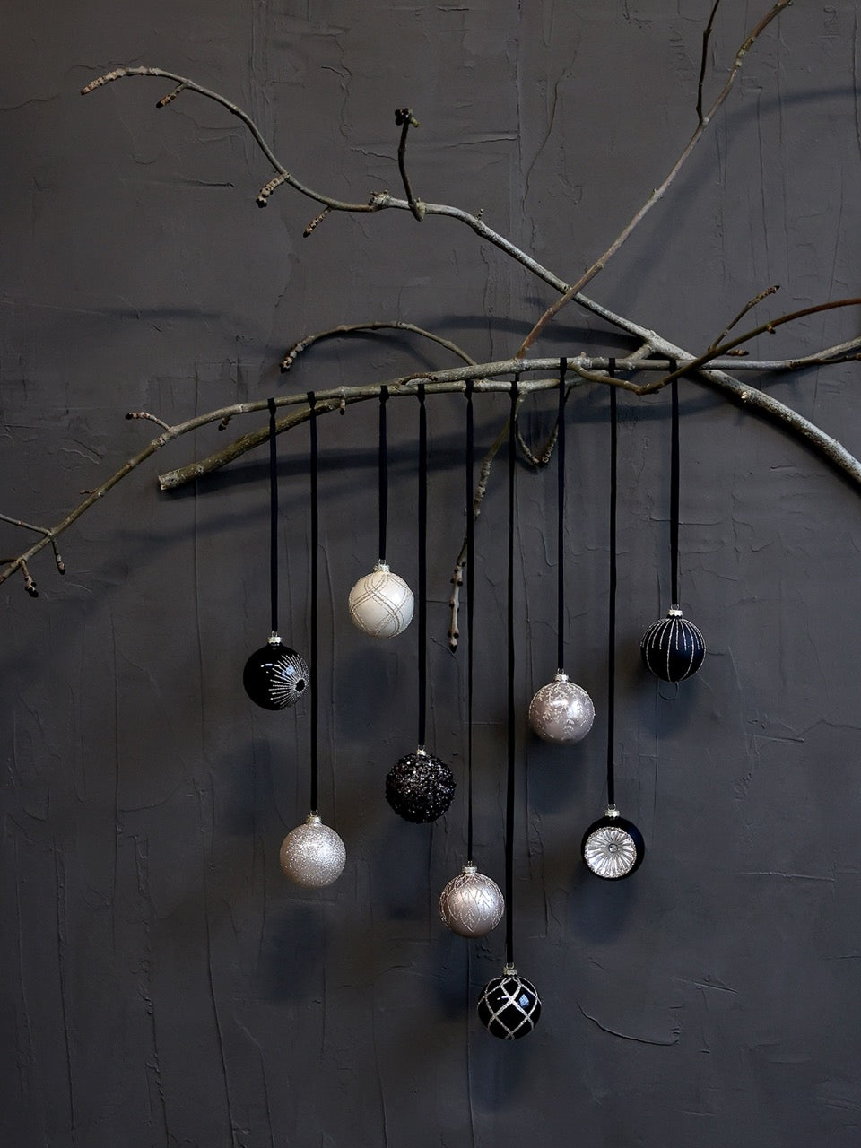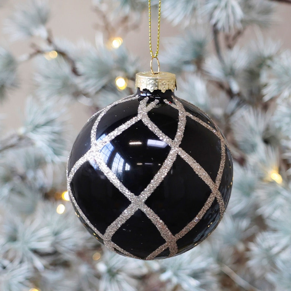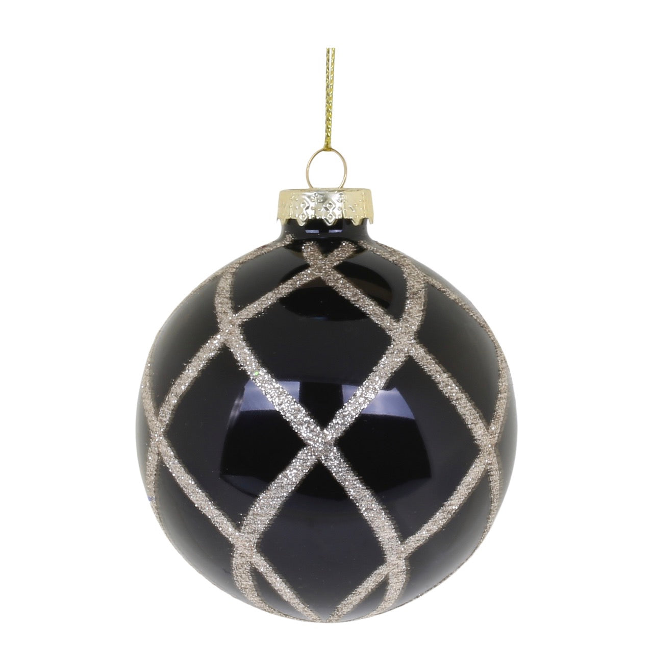 Musta-hopea salmiakkikuvioitu lasinen joulupallo | Ø8 cm