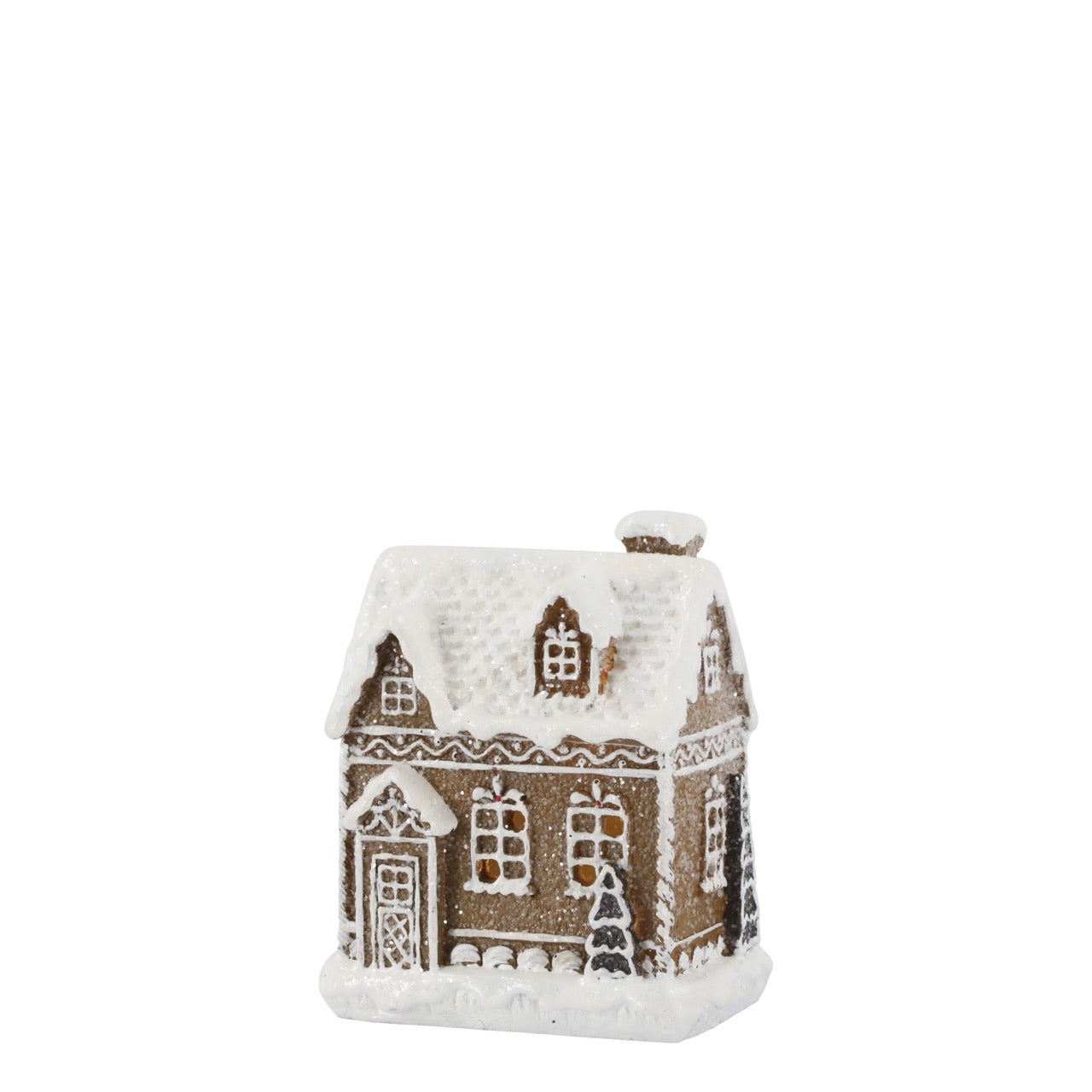 Ruskea piparkakkutalo on kuorrutettu lumella. Sen ikkunoista loistaa valot ja hohkaa lämpö. Pöytäkoriste on täydellinen tunnelmantuoja joulusisustukseen. Yhdistelemällä eri kokoiset piparkakkutalot keskenään voit luoda pienen piparkakkutalokylän. Piparkakkutalossa on ON/OFF kytkin LED-valoille ja se toimii kahdella LR44 paristolla.