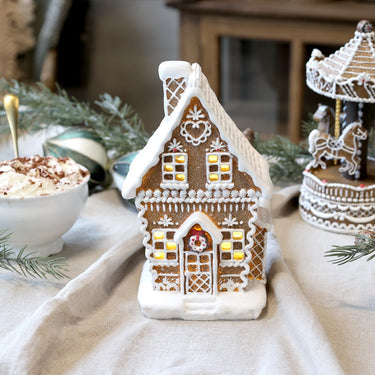 Ruskea piparkakkutalo on kuorrutettu lumella. Sen ikkunoista loistaa valot ja hohkaa lämpö. Pöytäkoriste on täydellinen tunnelmantuoja joulusisustukseen. Yhdistelemällä eri kokoiset piparkakkutalot keskenään voit luoda pienen piparkakkutalokylän. Piparkakkutalossa on ON/OFF kytkin LED-valoille ja se toimii kahdella LR44 paristolla.