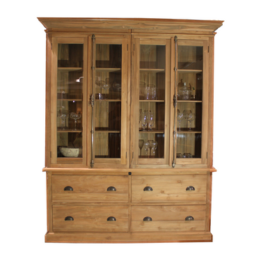 Kierrätystiikistä valmistettu 180cm leveä, 35cm syvä ja 220cm korkea vitriinikaappi neljällä tilavalla laatikolla on todellinen katseenvangitsija maalaisromanttiseen sisustukseen astia- tai kirjakaapiksi.