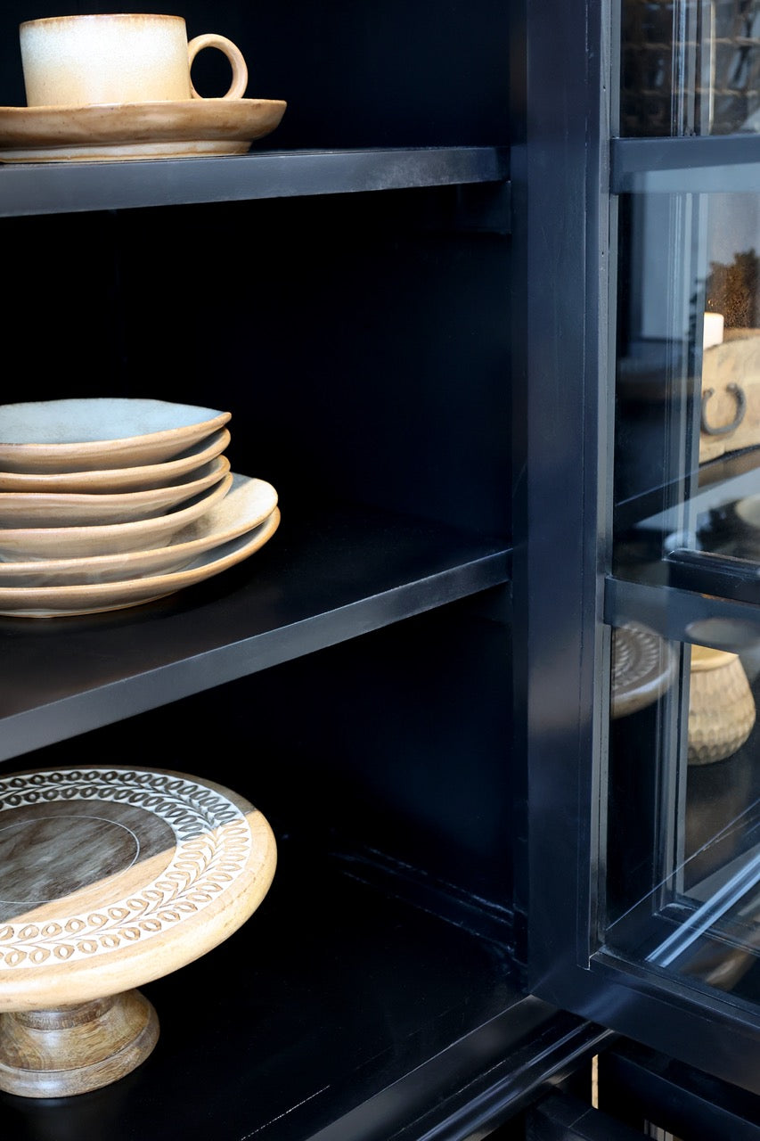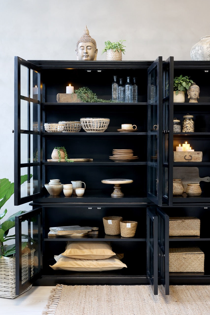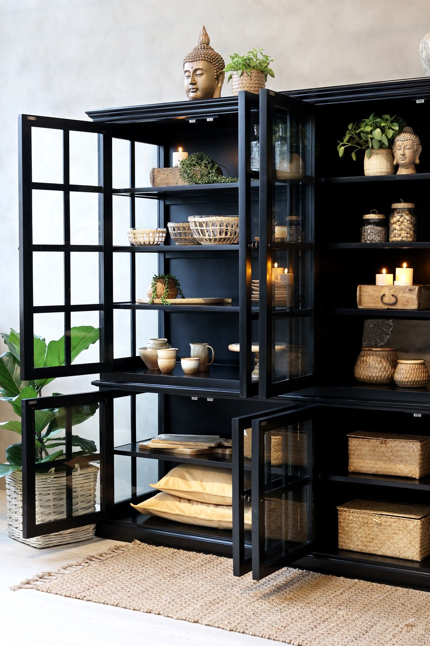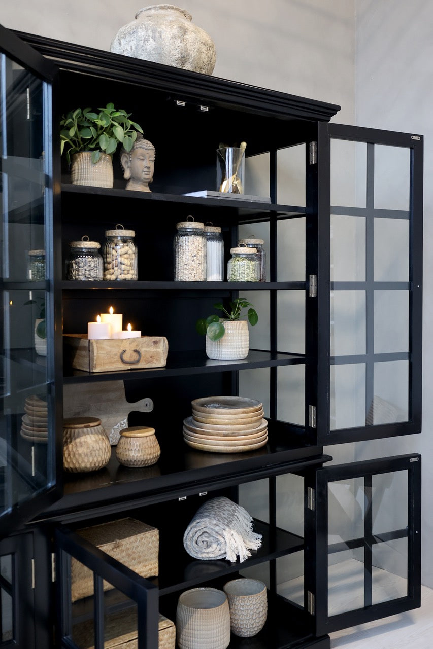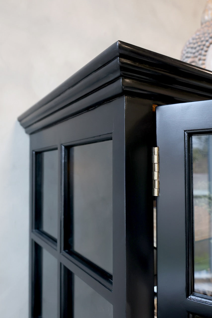 Suuri Marseille-vitriinikaappi on valmistettu kestävästä poppelipuusta ja siinä on elegantti mustaksi maalattu ja lakattu pinta.