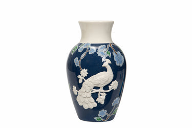 Keraamista tummansinipohjaista kukkaruukkua somistaa valkoinen riikinkukko ja vaaleansiniset kukat. Maljakon kuvitus vie ajatukset antiikin Roomaan ja Välimeren maisemiin.