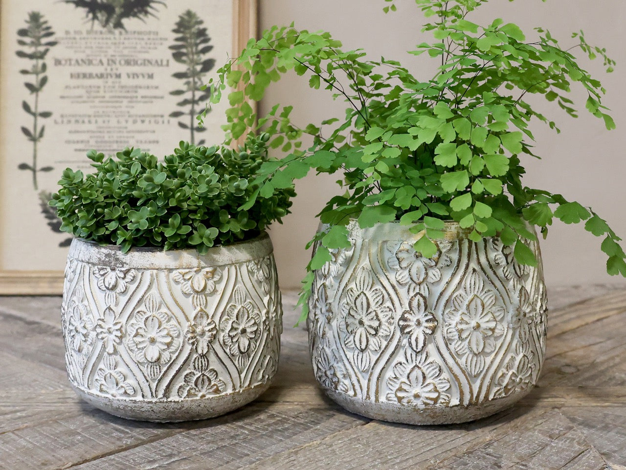 Kohokuvioitu sementistä valettu suojaruukku kukille. Ruukku on pohjasävyltään antiikkivalkoinen, kohokuvioituja ornamentteja koristaa mattakullan sävy. Ruukun pohjassa ei ole reikää. Ruukun paino 2,4 kg.