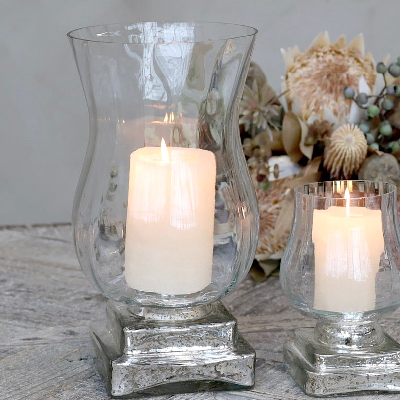 Lasinen hurrikaanilyhty hopeajalustalla | Ø10,5 x 27 cm