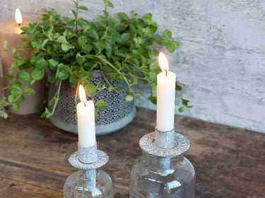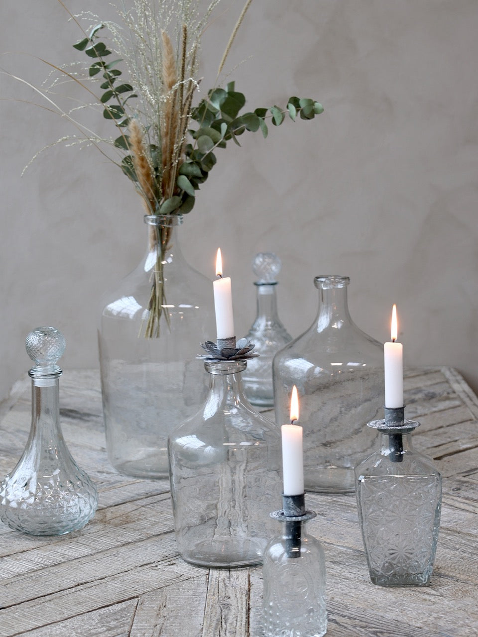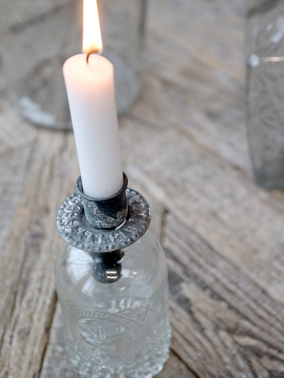 Sinkin sävyinen sävyinen raudasta valmistettu kynttilänjalka asetetaan pulloon. Yhdistä lampettikynttilän tai kruunukynttilän kanssa.