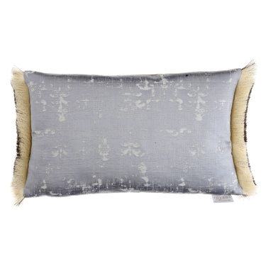 Orta-sisustustyynyssä on silkkimäistä hohdetta. Jacquard-tekniikalla kudottu kangas on eläväpintainen ja tyylikkäät hapsut tyynyn molemmissa päissä viimeistelevät tämän hopeasävyisen sisustustyynyn.