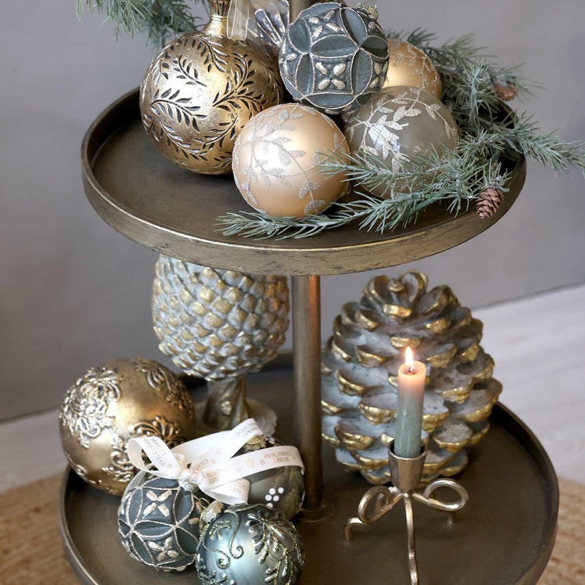 Käsin maalattu kauniin sammaleen vihreä joulupallo on kohokuvioitu ja koristeltu mattakullan sävyisillä ornamenteillä.