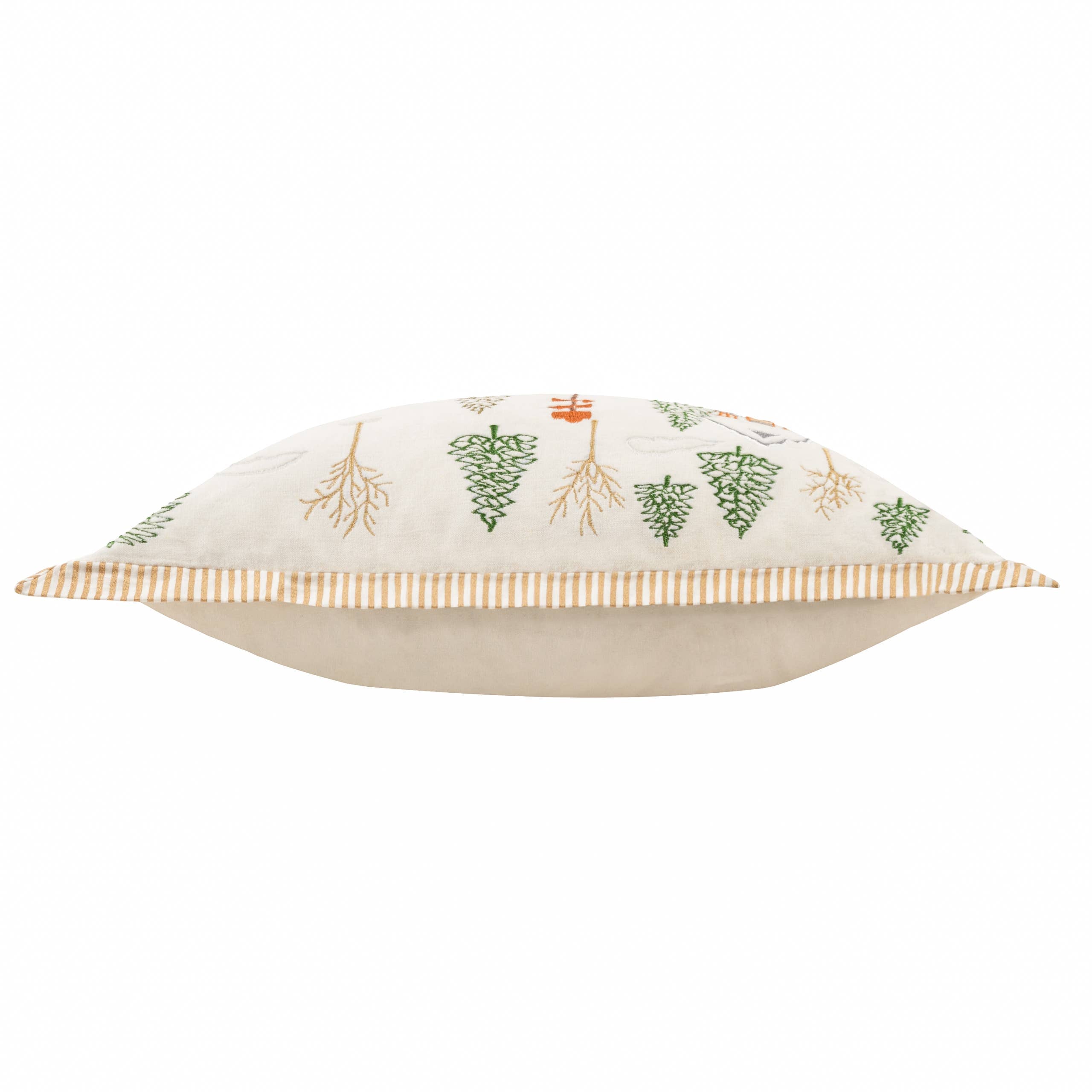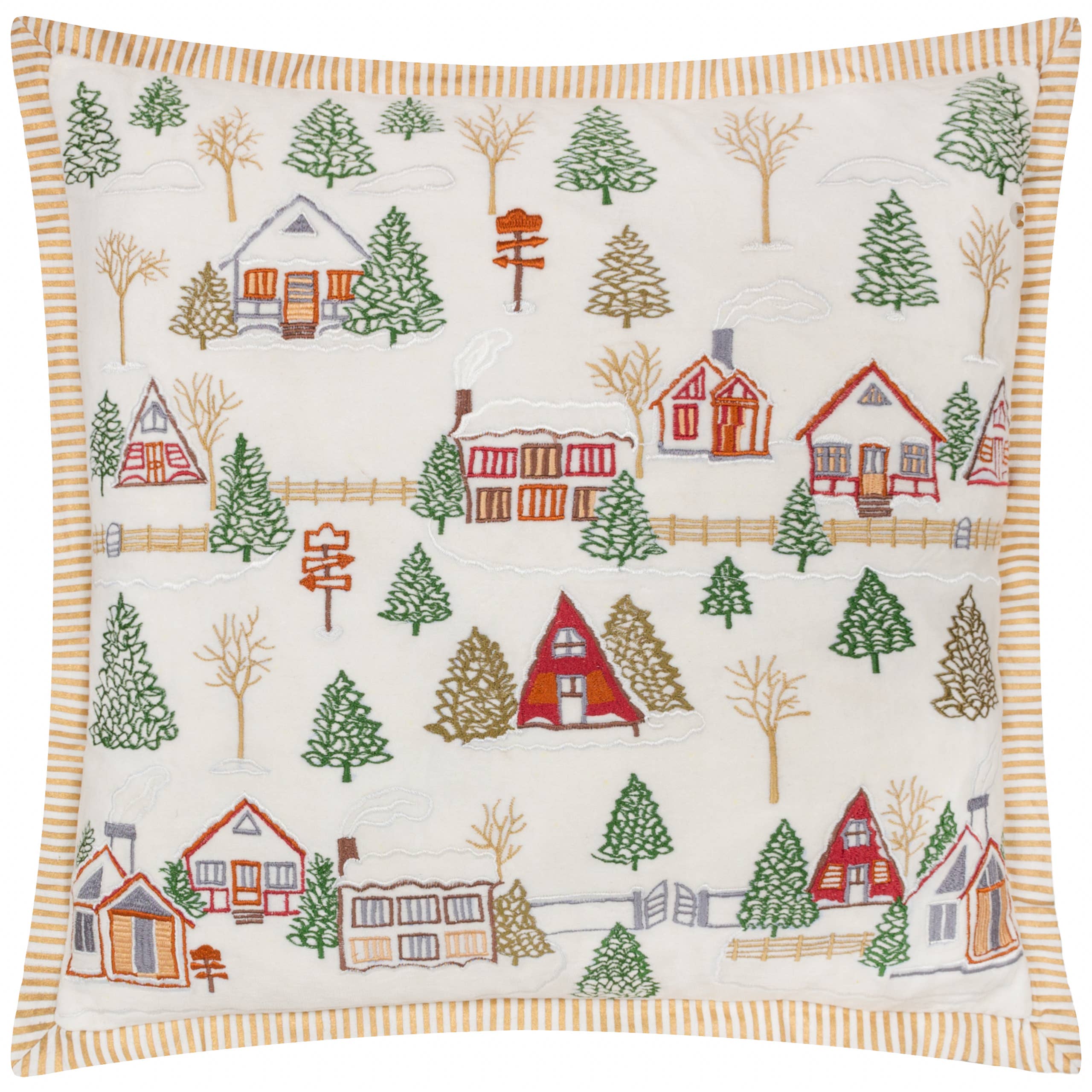 Valkopohjaiseen sisustustyynyliinaan on kirjailtu puna-vihreä alppikylämaisema. Tyynyn kääntöpuoli on valkoinen.