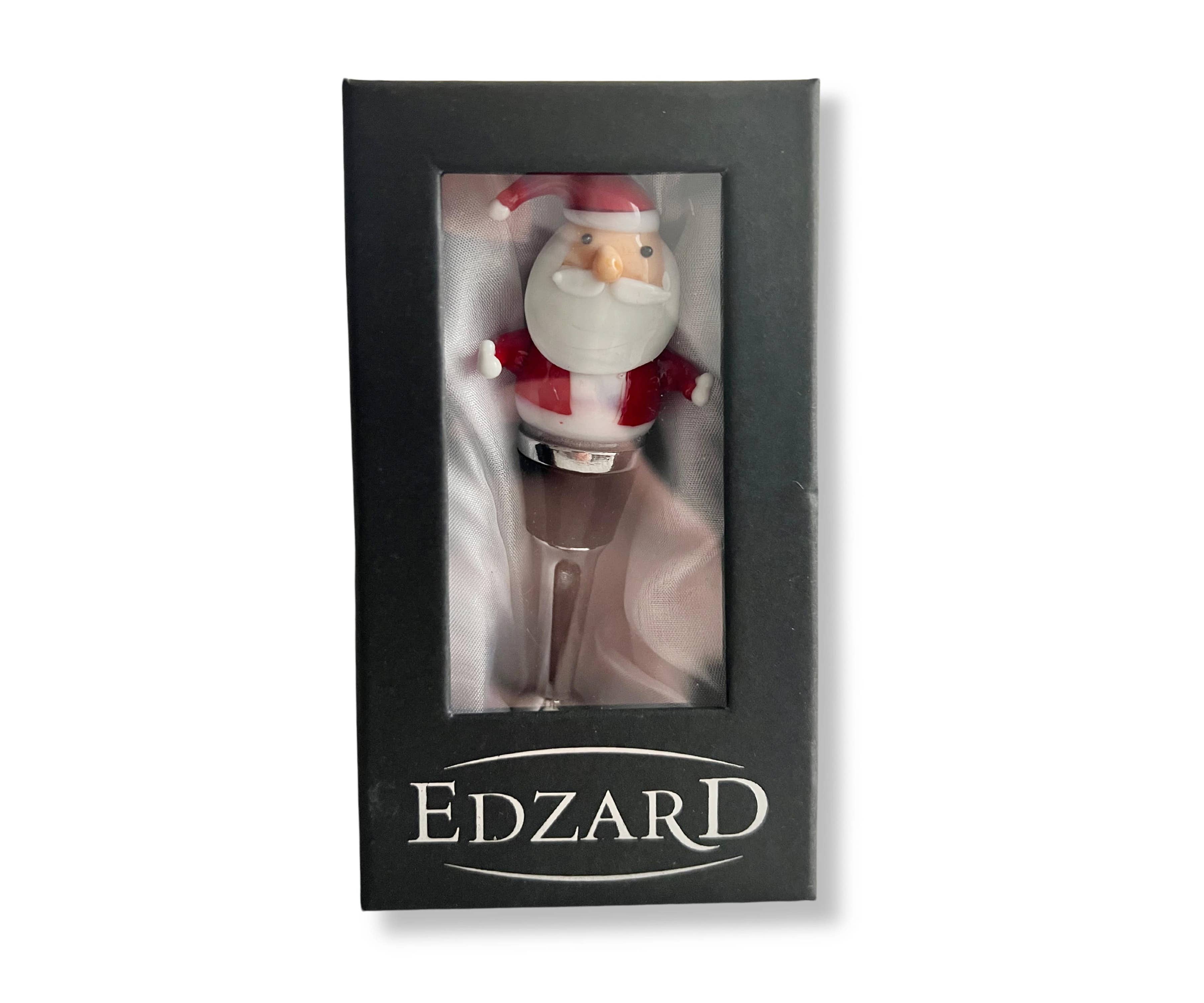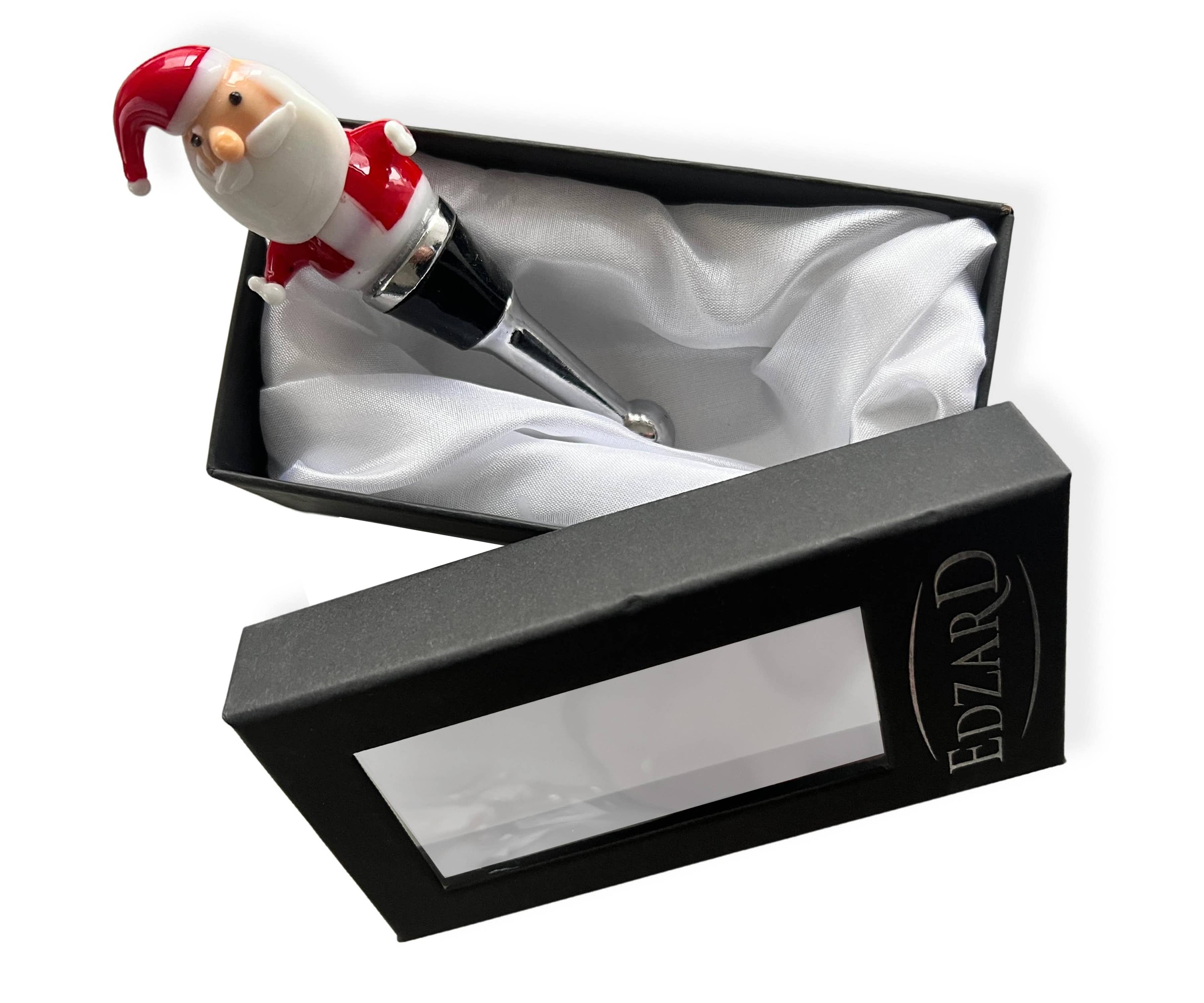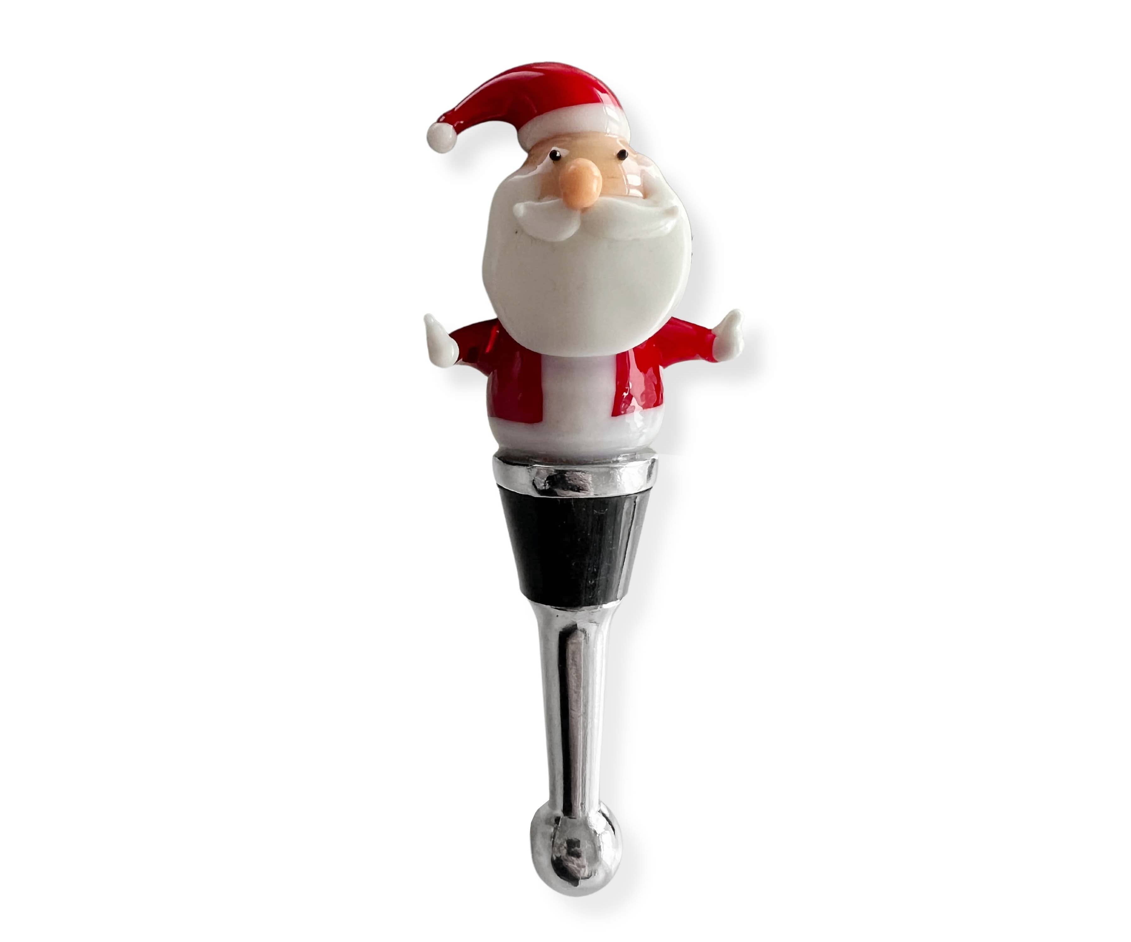 A red-faced Santa Claus decorates the wine bottle stopper and the glass decoration is made in the style of Murano glass technique.