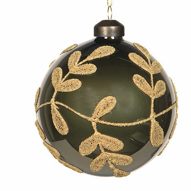 This glass Christmas bauble glows beautifully in its olive green metallic hue. The Christmas bauble is surrounded by golden glittering olive leaves. Hang it on your Christmas tree or as a window decoration. Combine and vary it with other Christmas baubles in the series.
