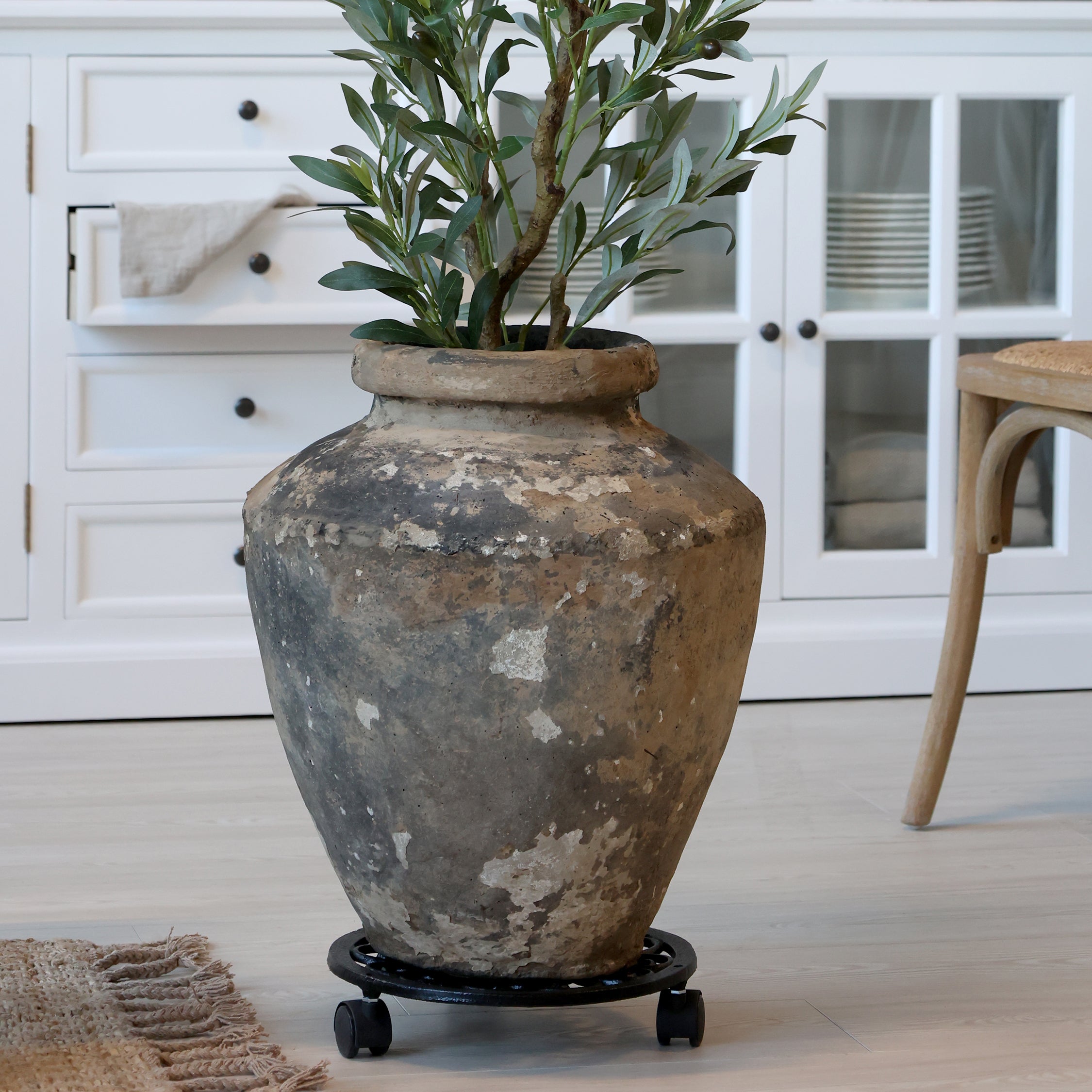 The black metal flower pot stand is equipped with wheels to make it easy to move the pot. The maximum weight of the pot is 20 kg.