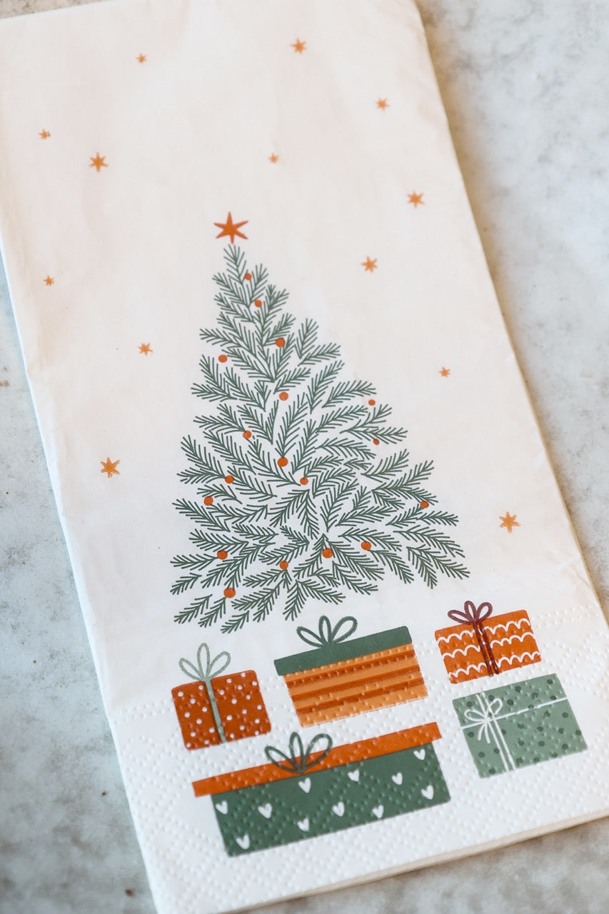 A 3-ply paper napkin with a Christmas tree and gift boxes printed on a cream-colored background. The package contains 16 napkins.