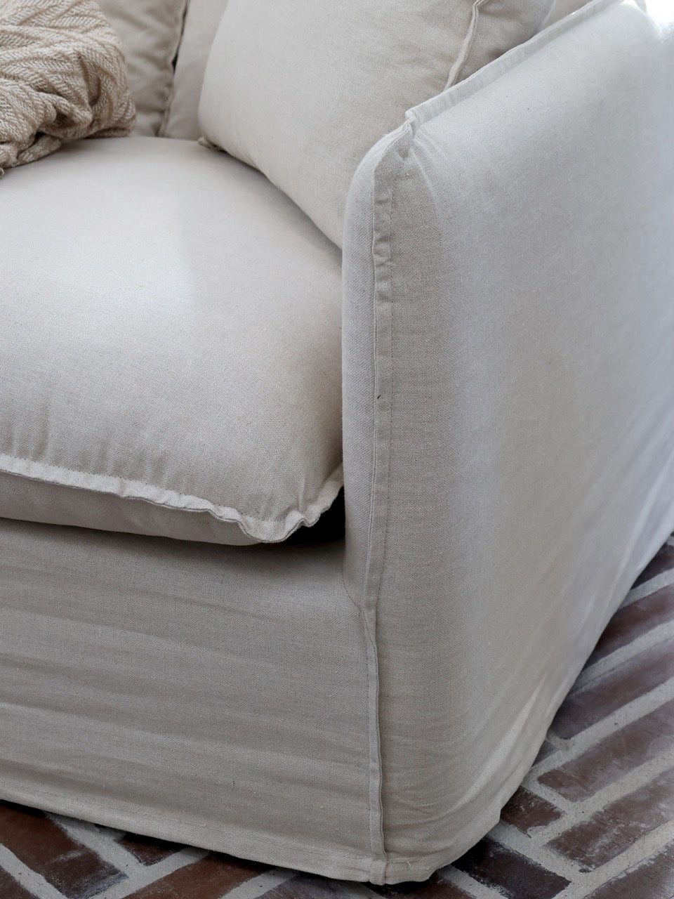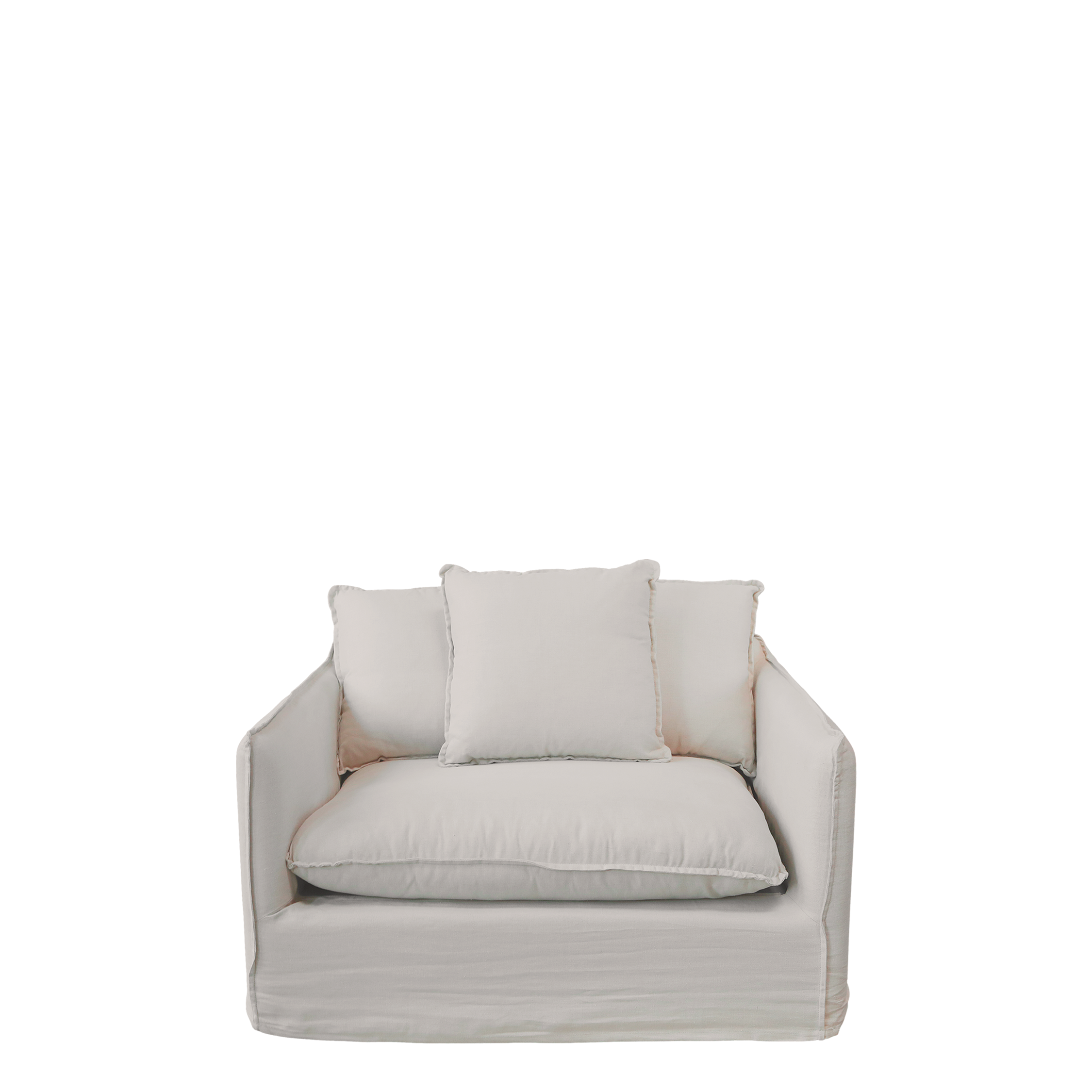The natural linen-toned armchair has 3 loose cushions in addition to the seat cushions.