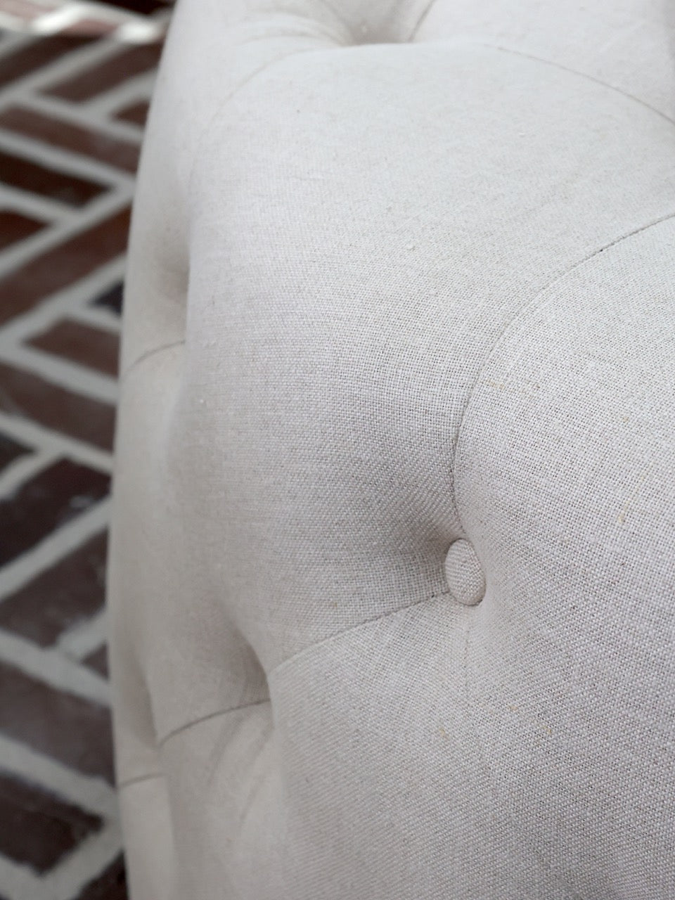 This stylish linen ottoman has a natural linen color. The fabric has been treated to be fireproof.