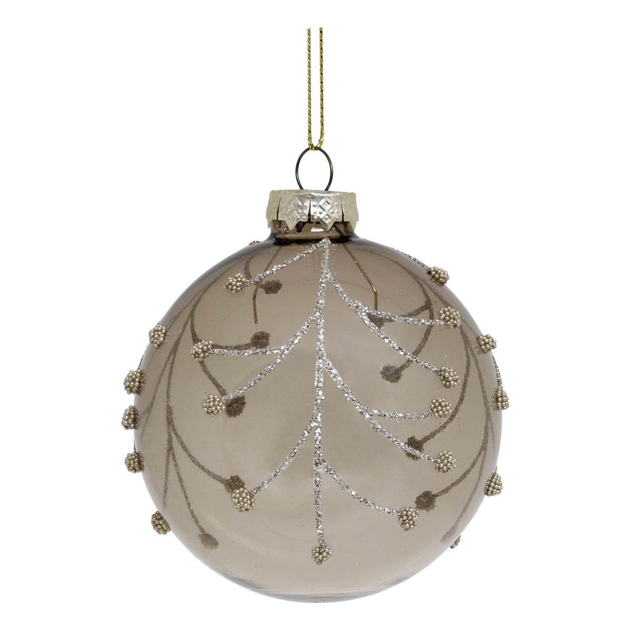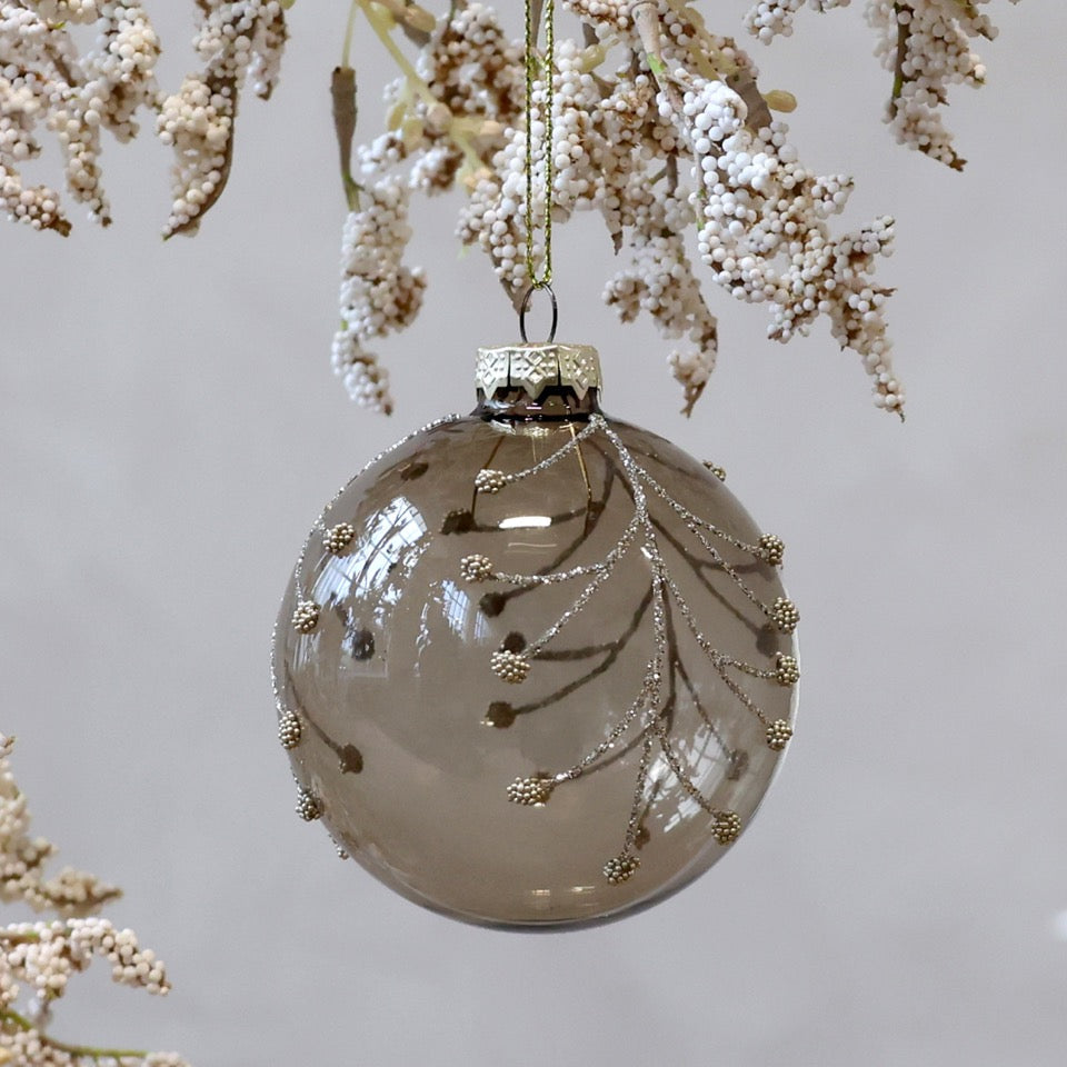 This simply beautiful glass Christmas ball is a delicate and natural decoration with a sophisticated touch. The ball is colored in a translucent smoky gray, which gives it a soft and elegant look. Its surface features sparkling branch decorations resembling winter plants. This lovely nature-themed Christmas tree decoration is also suitable as a window decoration.