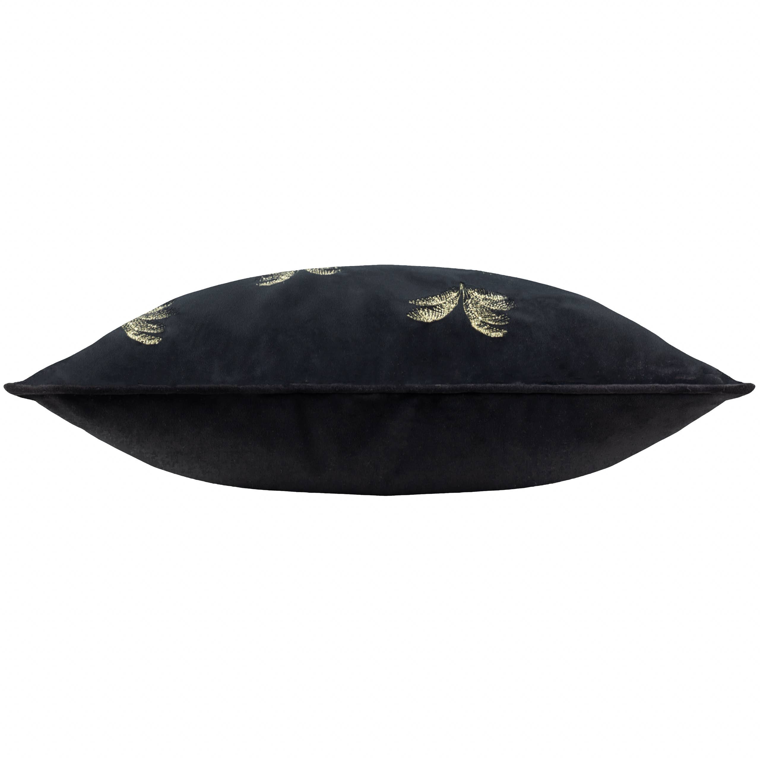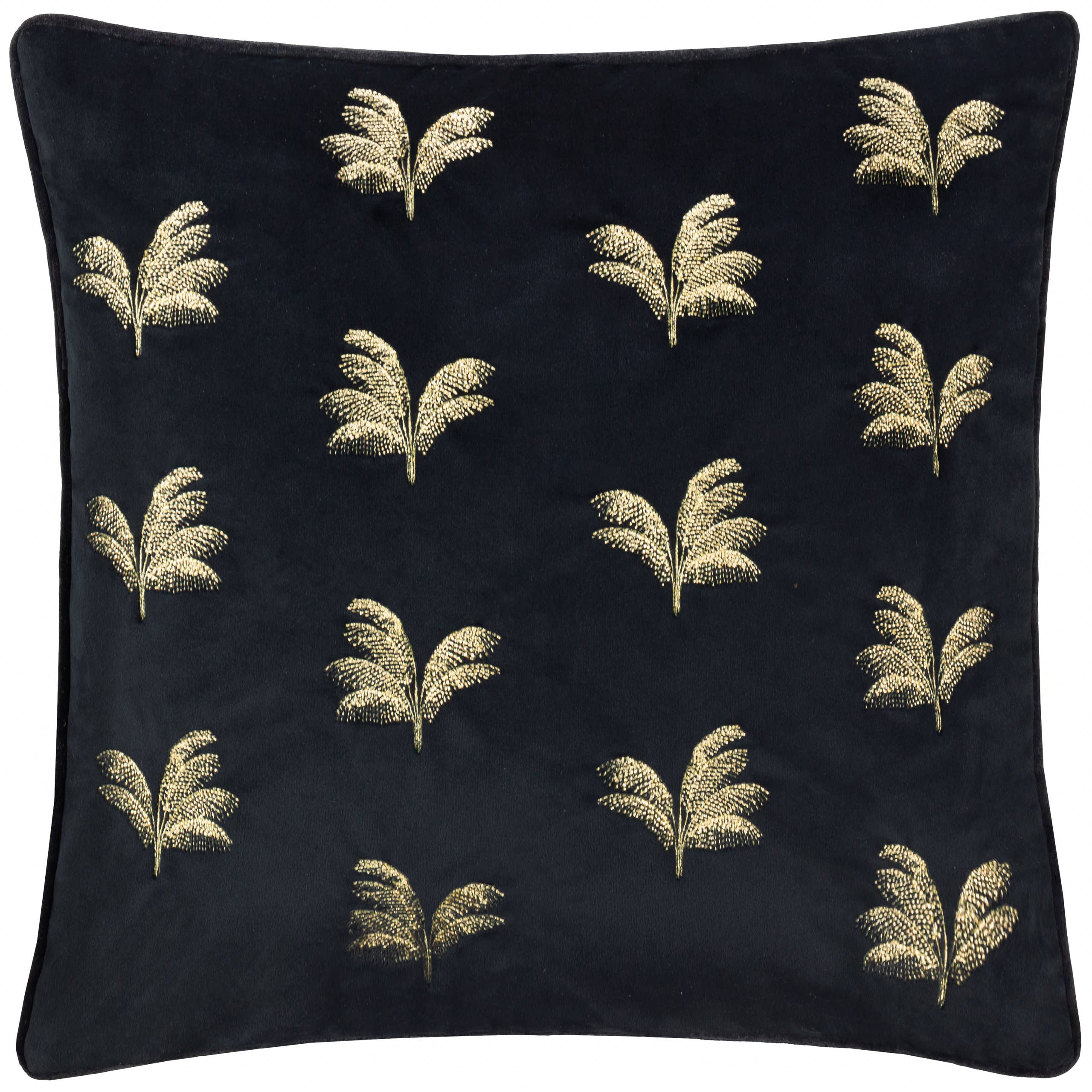 Mustassa samettisessa Gilded Palms -sisustustyynyssä on kaunis kullansävyinen palmunlehtiä esittävä kirjailu.