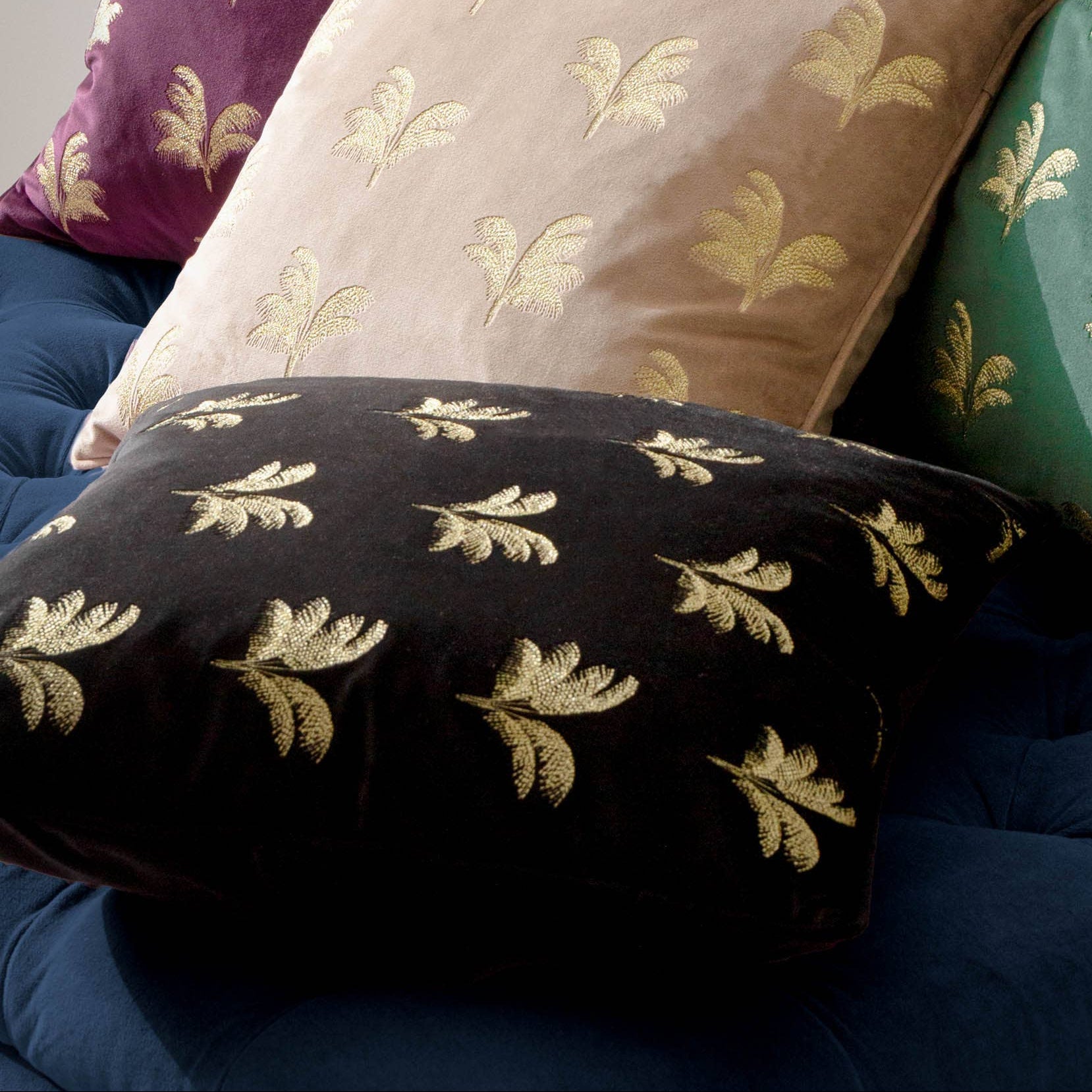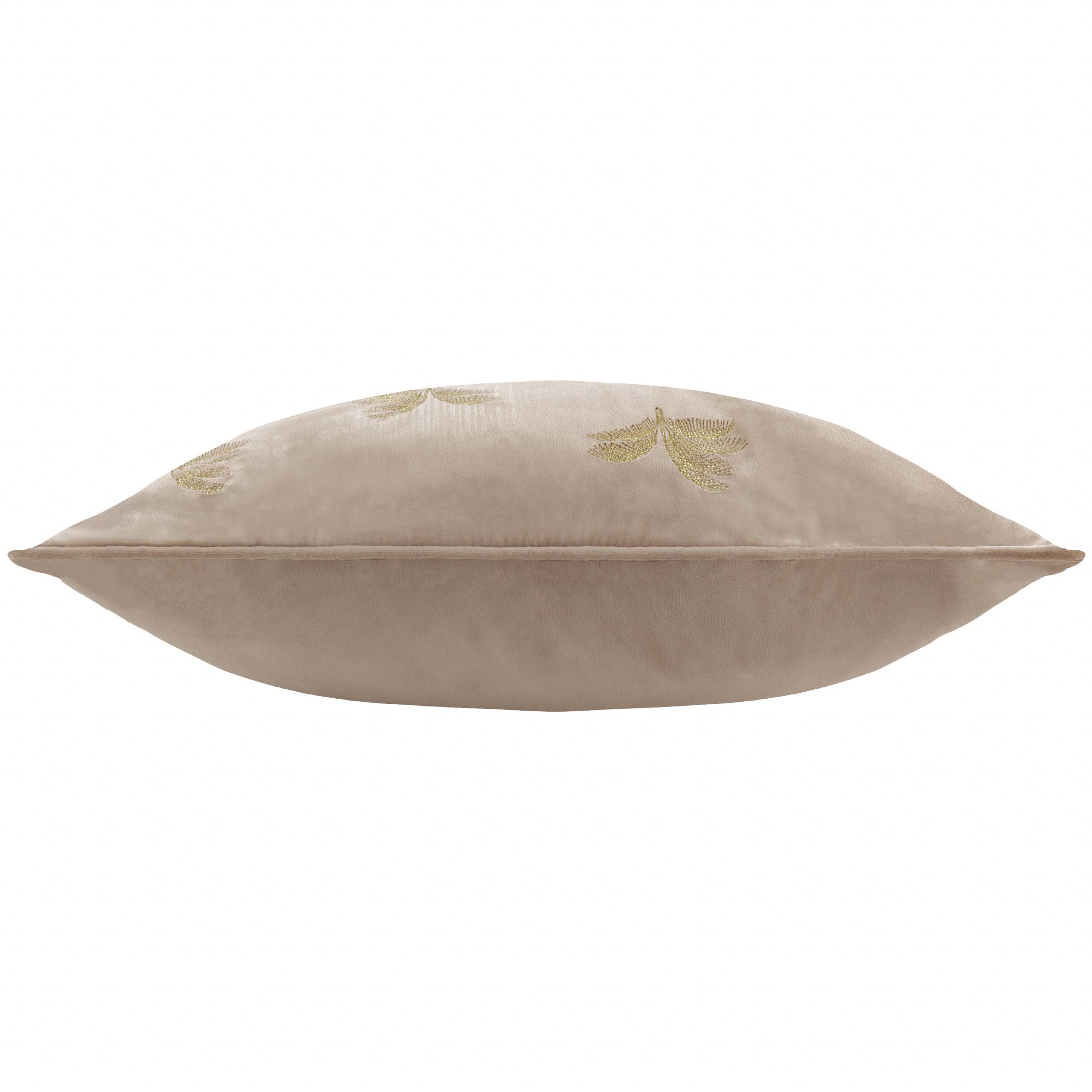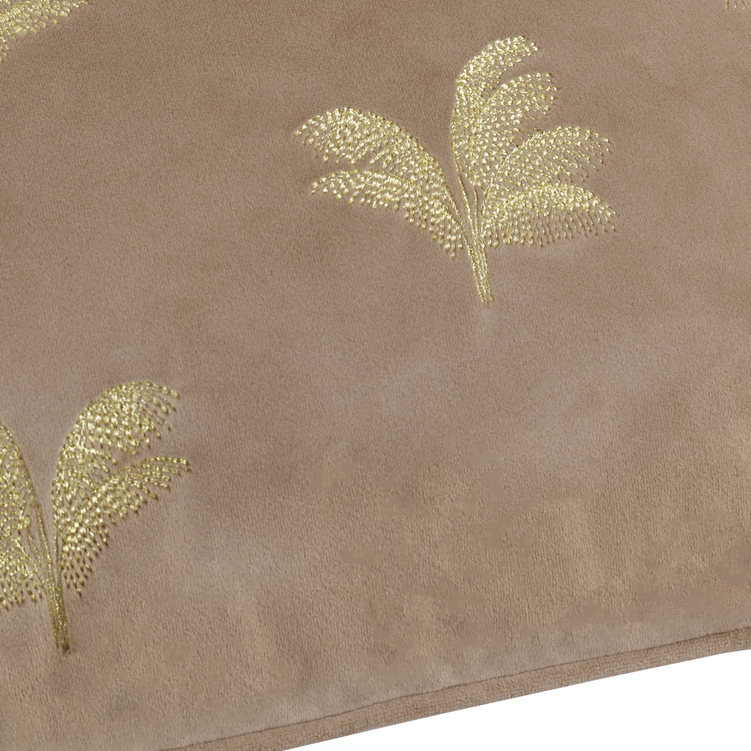 Nuden sävyisessä samettisessa Gilded Palms -sisustustyynyssä on kaunis kullansävyinen palmunlehtiä esittävä kirjailu.
