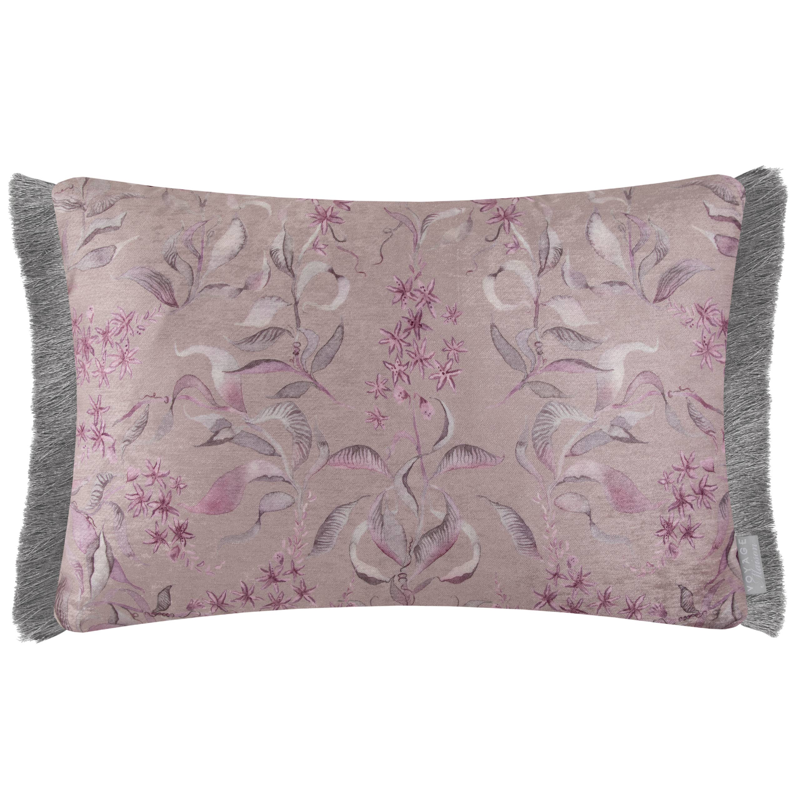 Vaaleanpunasävyinen sisustustyyny hapsuilla, jonka kuvituksena on 1900 alun puutarhoista inspiraationsa saanut kukkakuvitus. Sisustustyynyn etupuoli on chenille-kangasta.