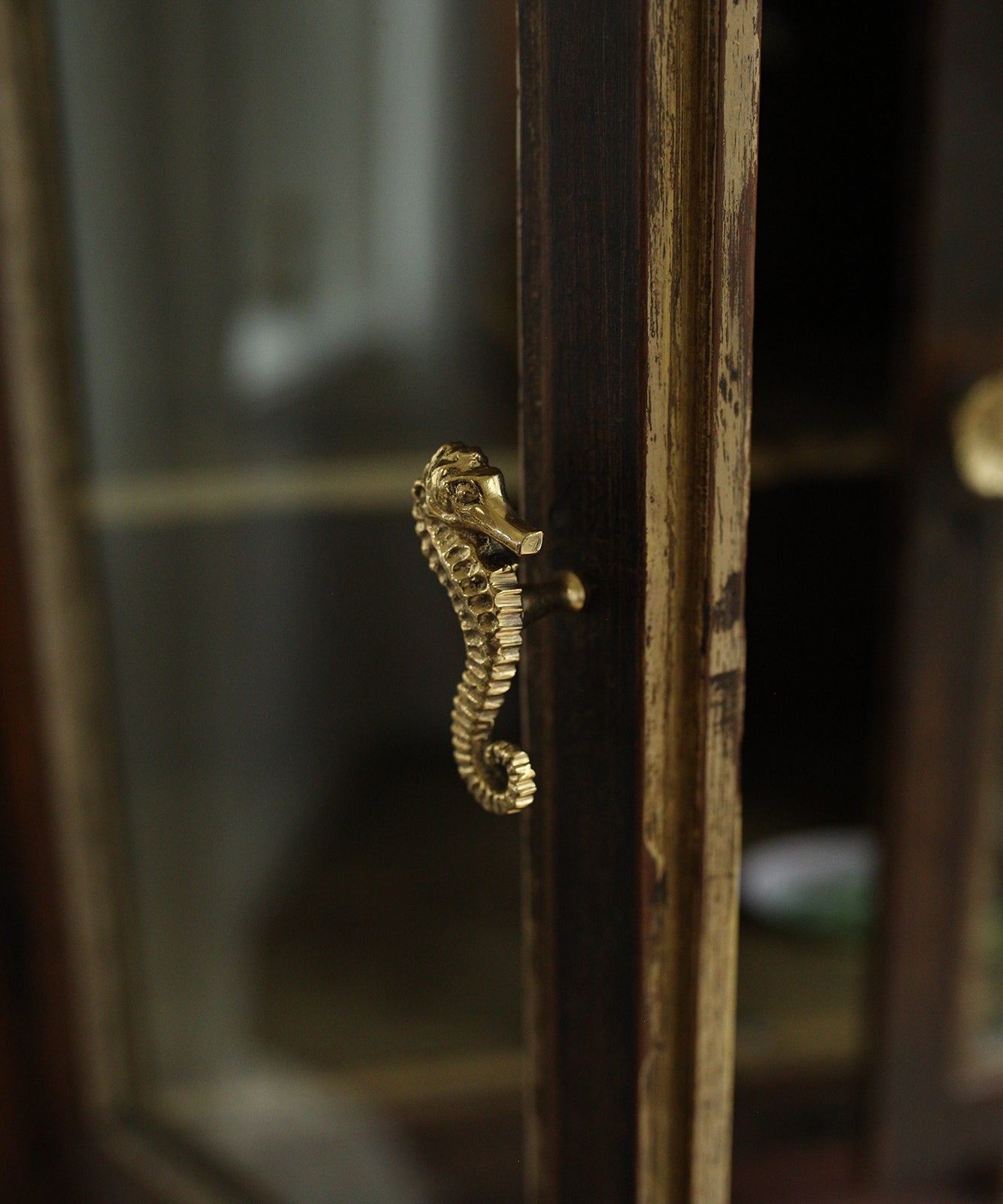 Messinkinen kolmiulotteinen merihevonen-nuppivedin tuo persoonallisen ilmeen kalusteisiin.