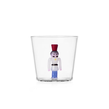 Käsinpuhallettu juomalasi, jonka sisällä on lasista puhallettu sotilas. Design by Alessandra Baldereschi.