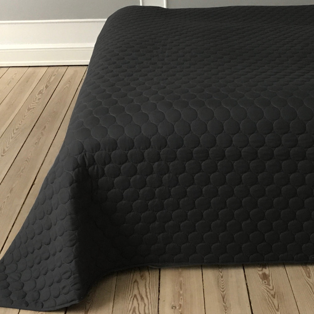 The quilted dark green bedspread is lightweight and easy to care for.