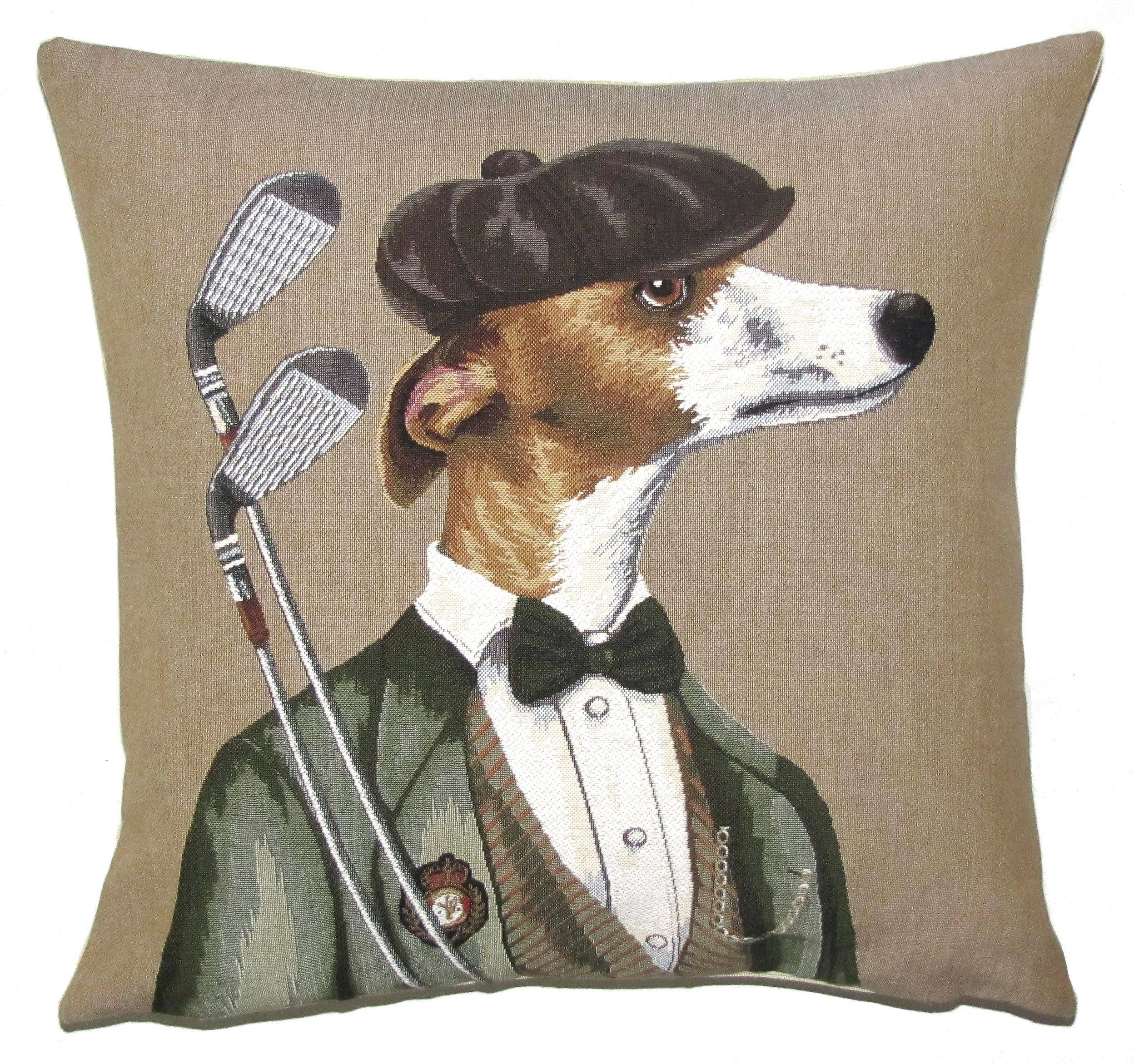 Laadukas beigen sävyinen jacquard-kudottu tyynynpäällinen hauskalla ja tyylikkäällä whippet kuvituksella. Sisustustyynyliina on belgialaista käsityötä golf-teemalla ja täydellinen lahja golffaamisen ystävälle.