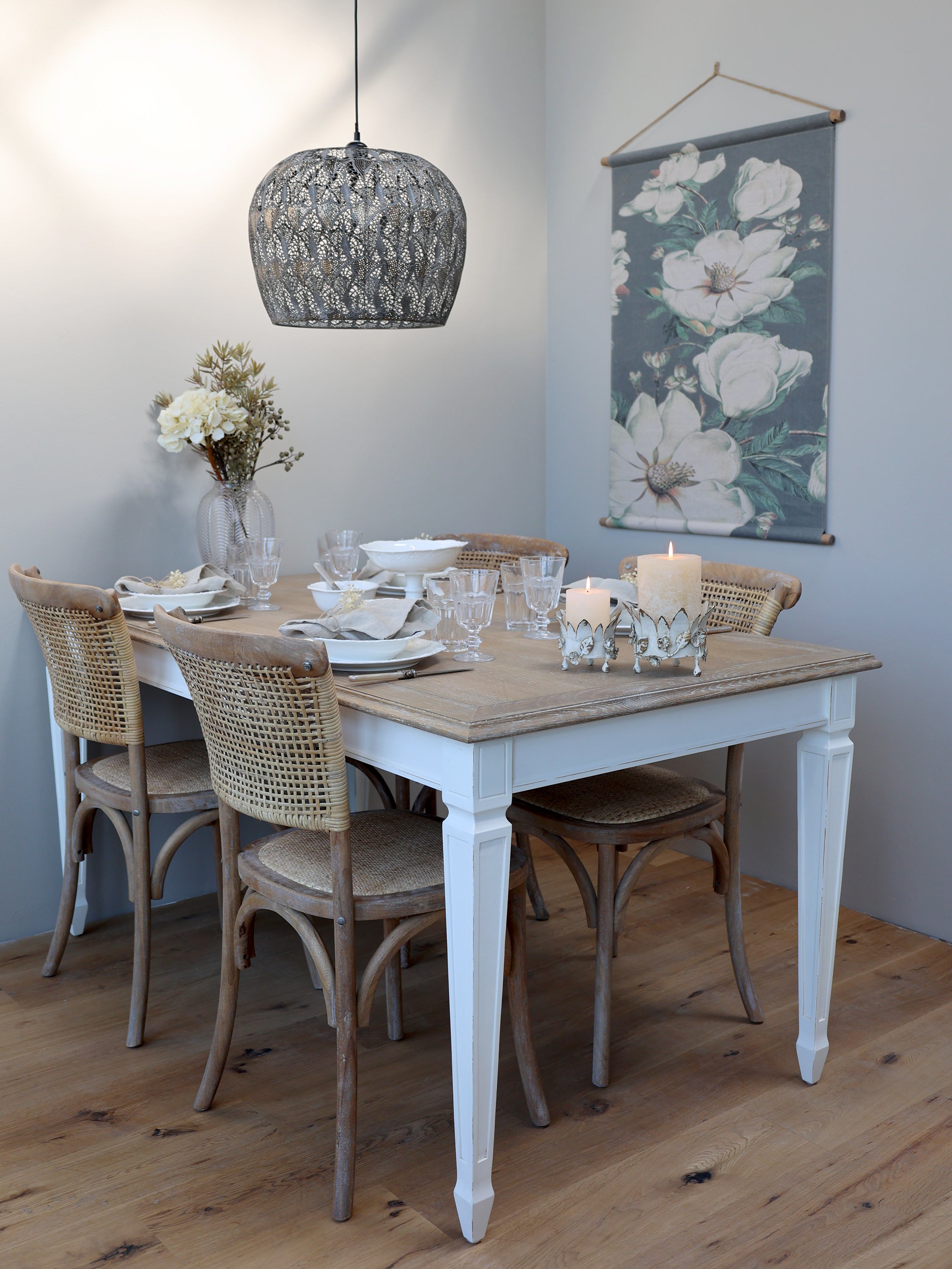 Klassinen bistrohenkinen ruskea rottinkituoli sopii maalaisromanttiseen ja rustiikkiseen sisustukseen.