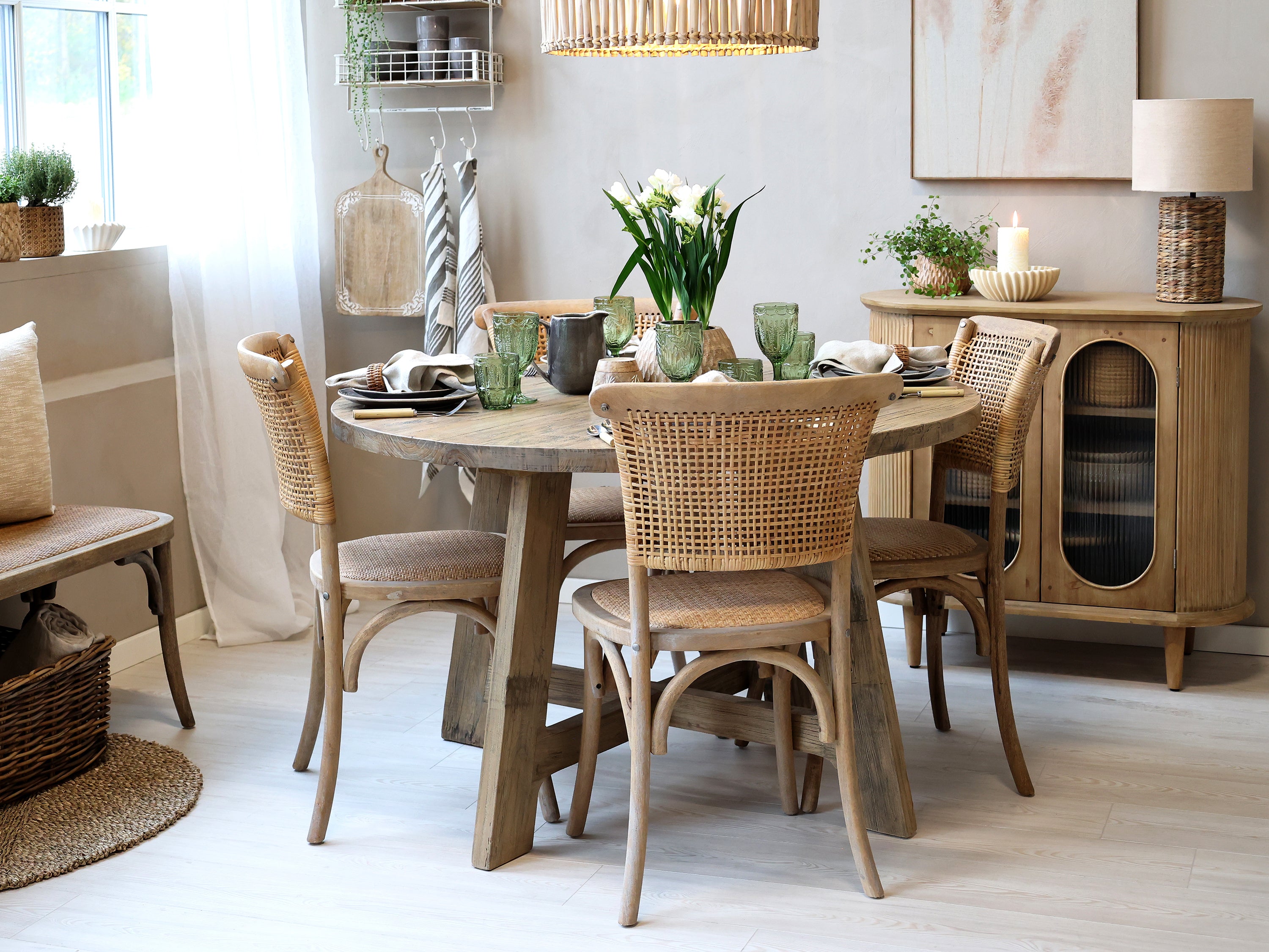 Käsityönä valmistetun tuolin istuinosa sekä selkänoja ovat rottinkia. Tuolin puuosat ovat kumipuuta, joka on kevyt ja kestävä puulaji.