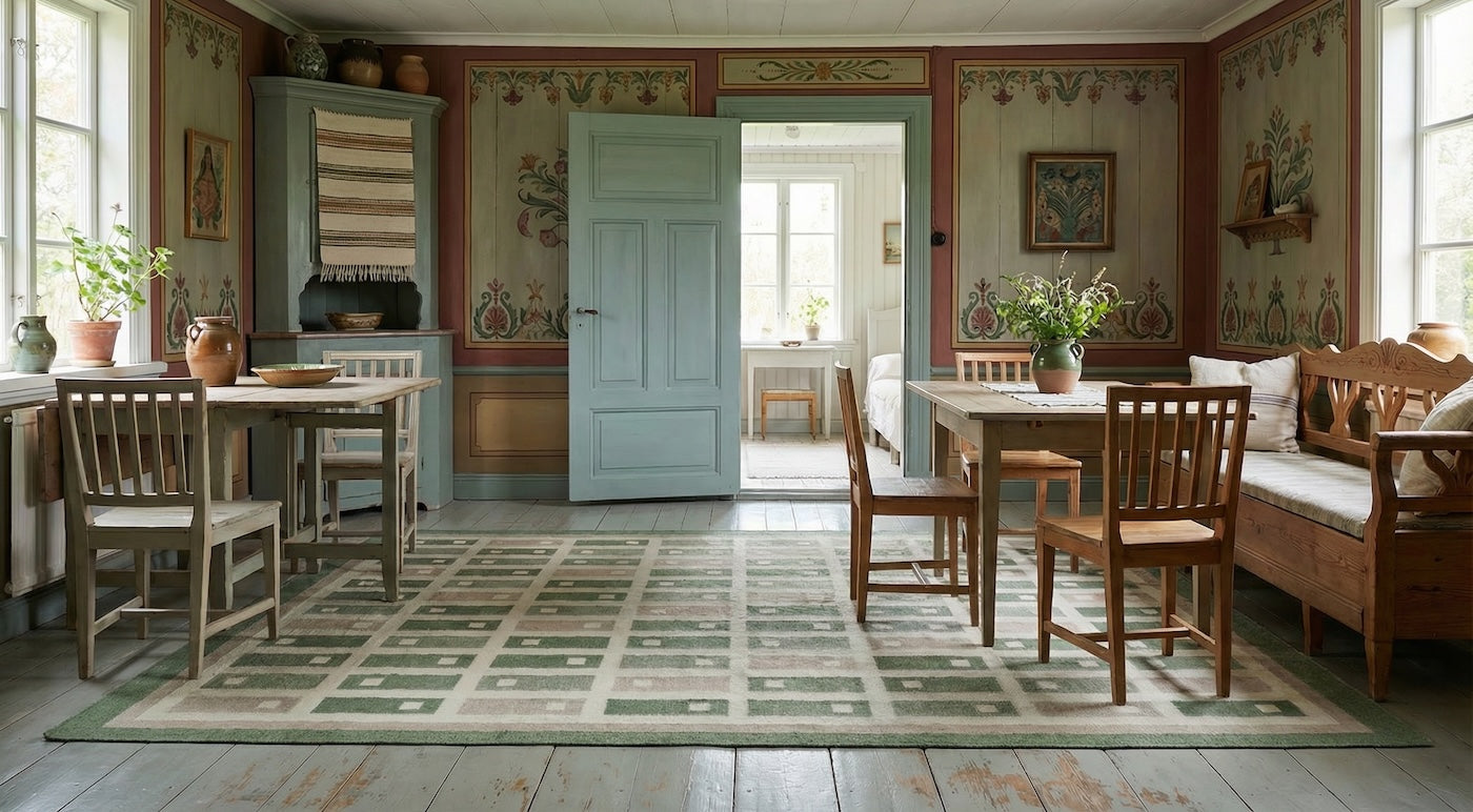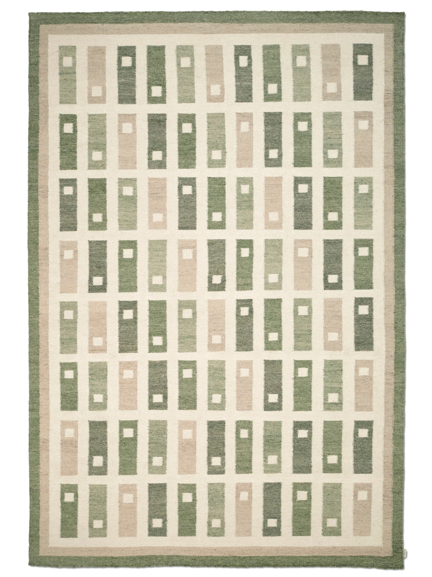Fyrbo on Classic Collection Heritage-malliston käsinkudottu Röllakan-tyylinen tasokudottu villamatto, jossa perinteisistä ruotsalaisista tekstiileistä inspiroitunut toistuva blokkikuvio luo selkeän graafisen ilmeen.