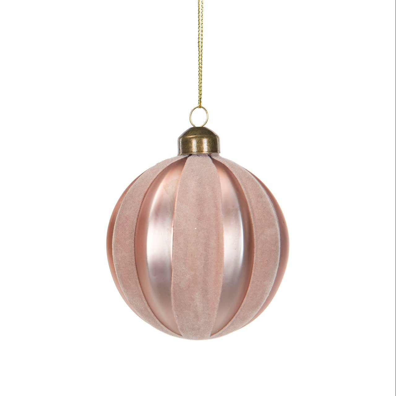 Vaaleanpunasävyisen lasisen joulupallon pinnassa vuorottelevat samettipäällysteiset ja kiiltävät raidat.
