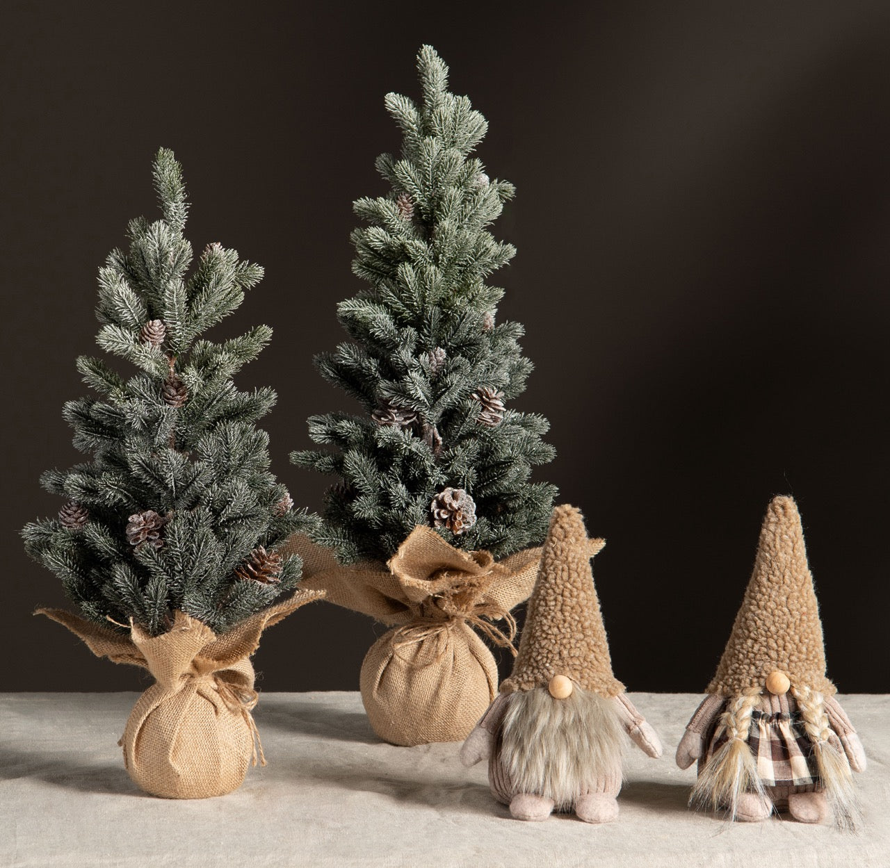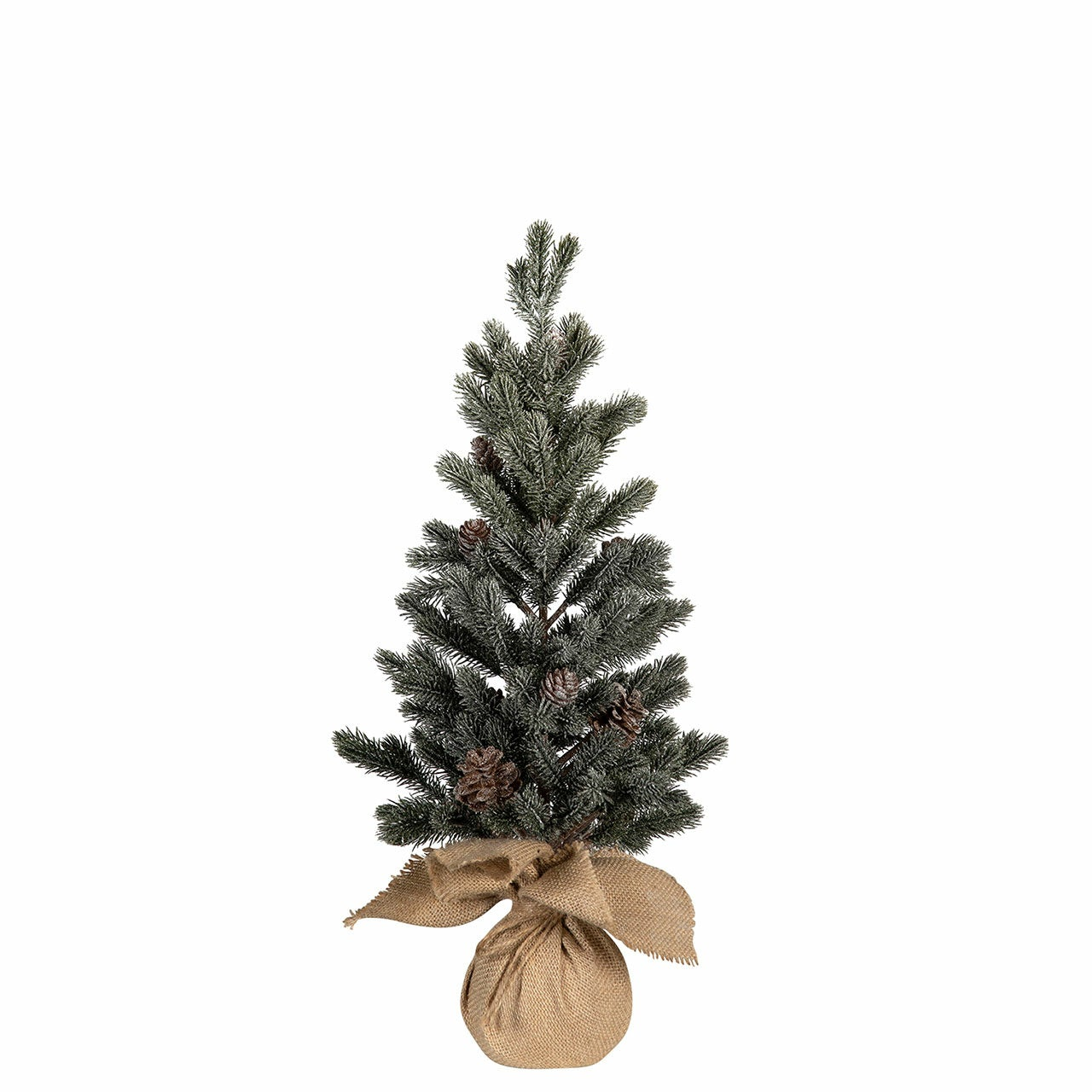 Tämä pieni kestokuusi tuo talvista tunnelmaa kotiin ja ilahduttaa vuodesta toiseen. Puun oksia koristavat kävyt ja sen juuret on kiedottu rustiikkiseen juuttikankaaseen. Pöytäkoriste luo joulutunnelmaa juhlapöytään ja sopii pieneen tilaan.