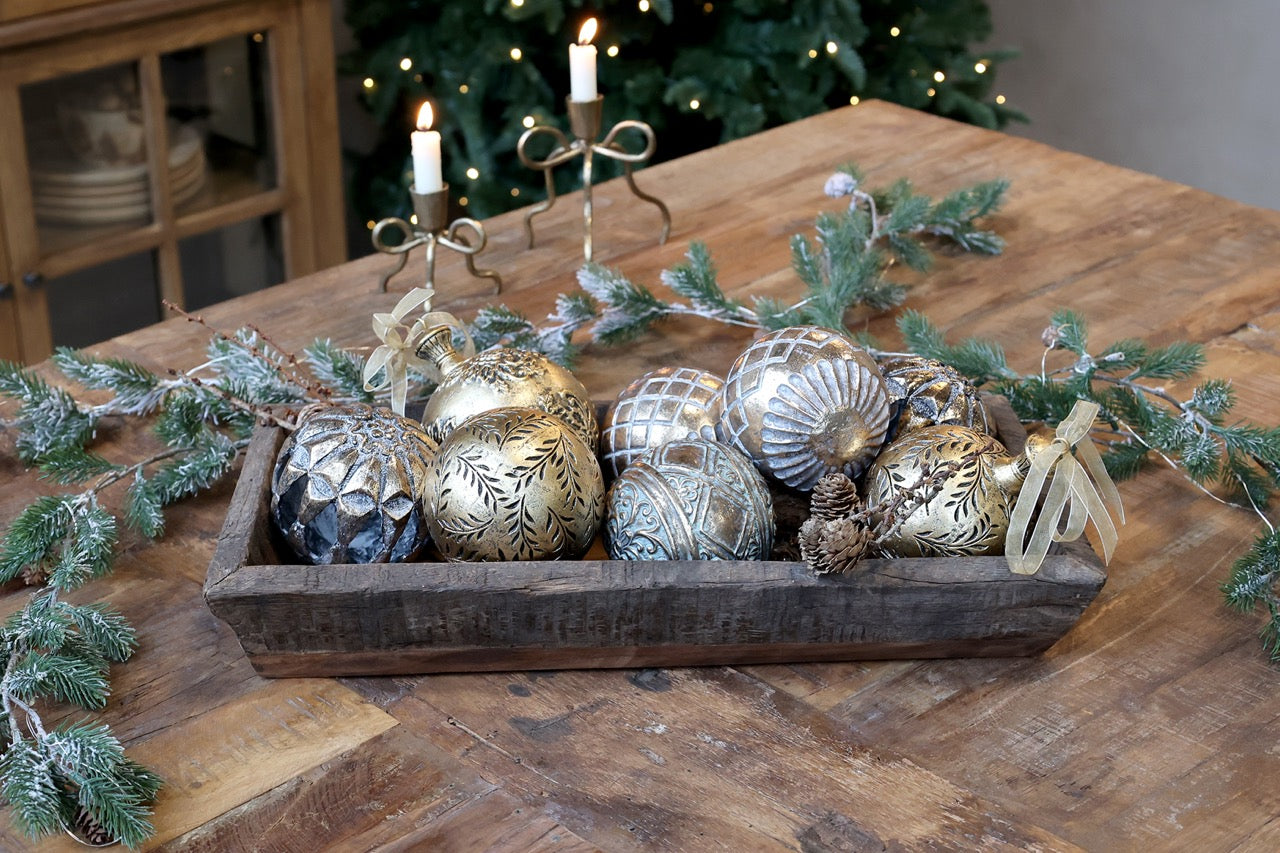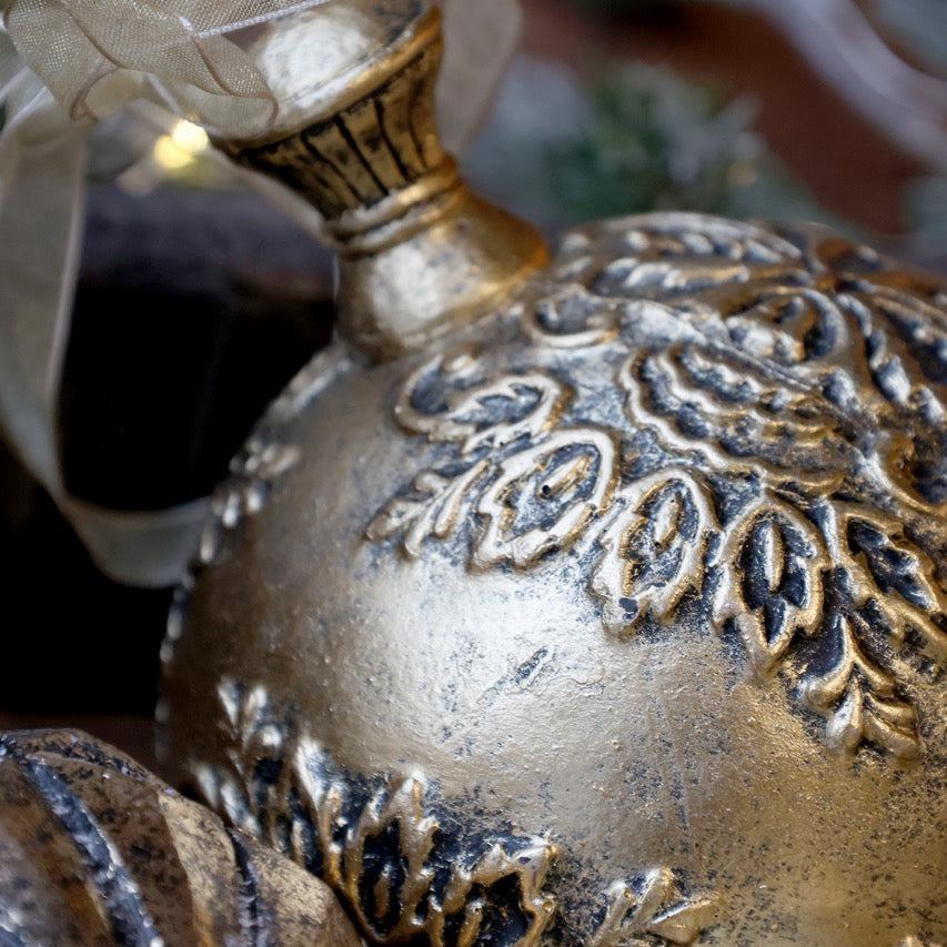 Luo kotiisi arvokasta vanhanajan tunnelmaa tällä antiikkimessingin värisellä koristeella. Joulupallo on kauniisti ornamenttikuvioitu.
