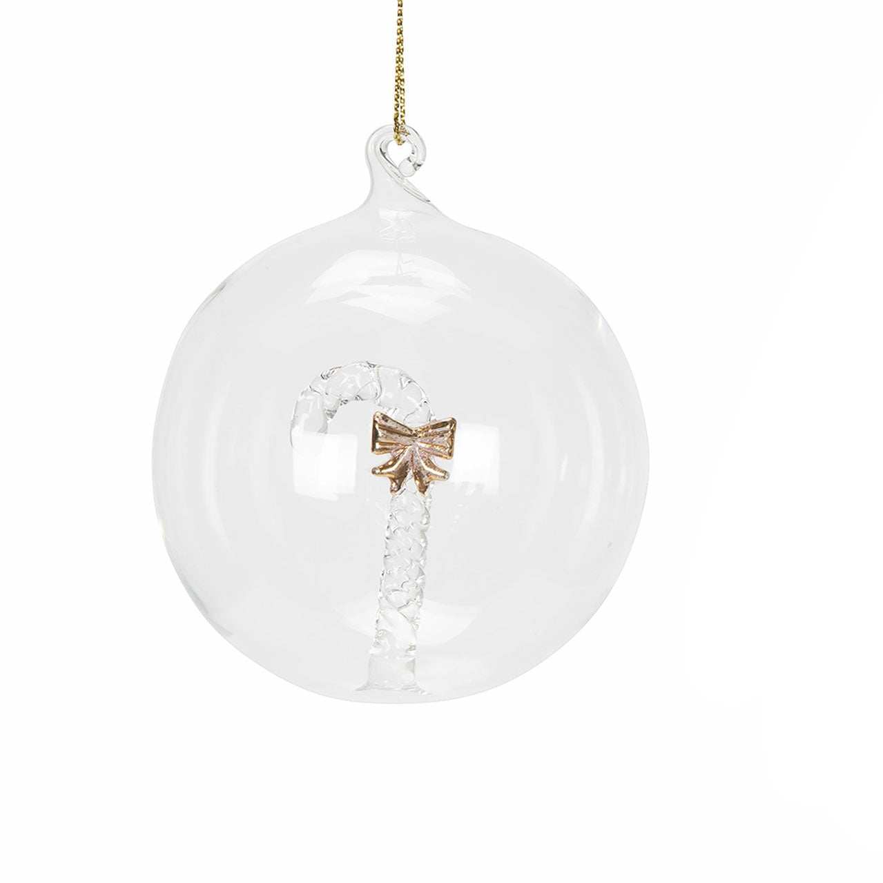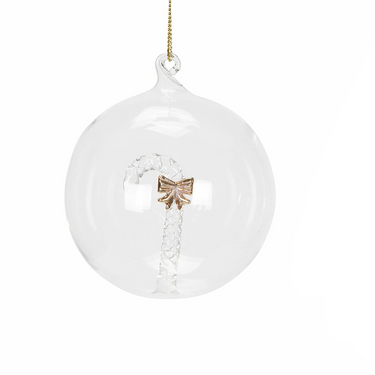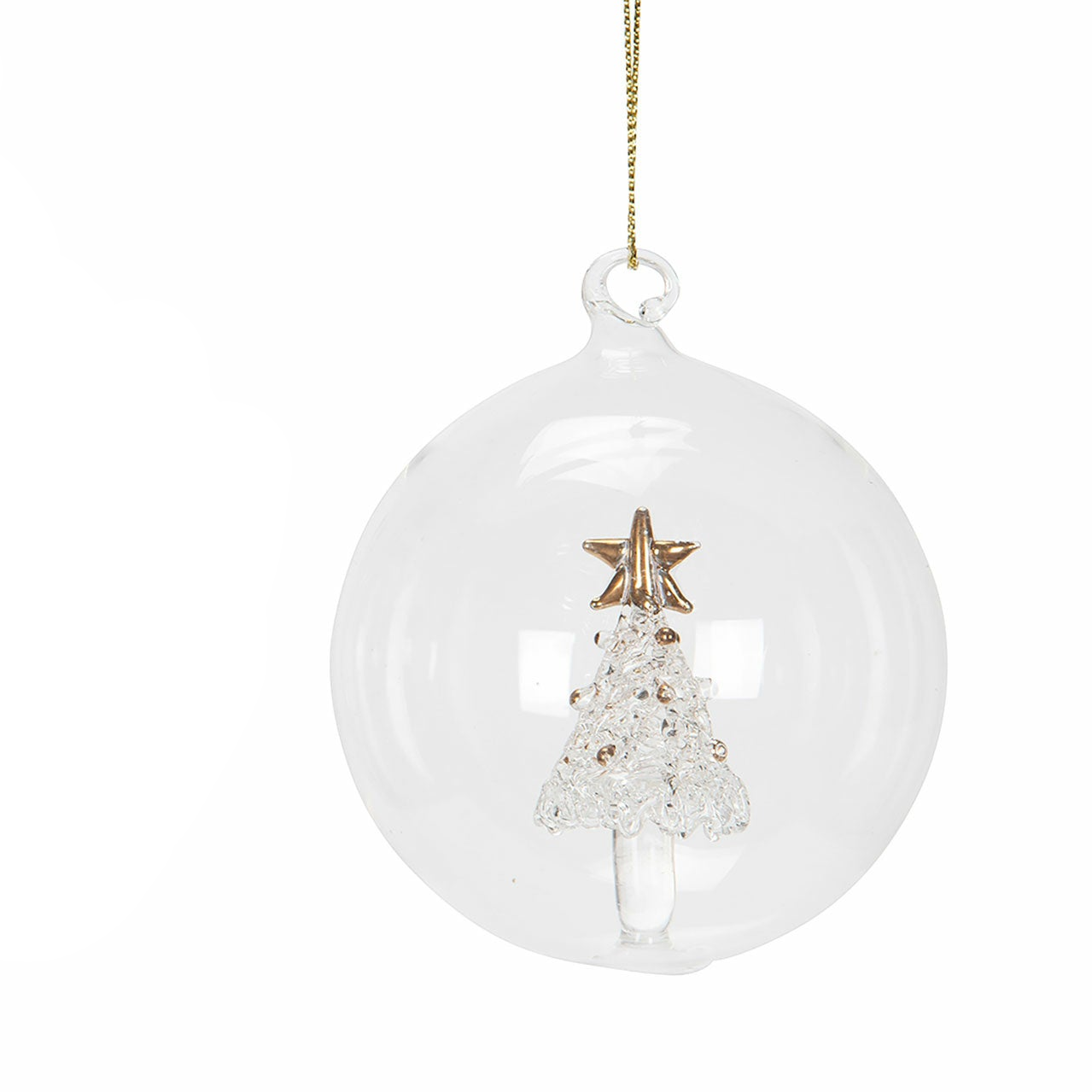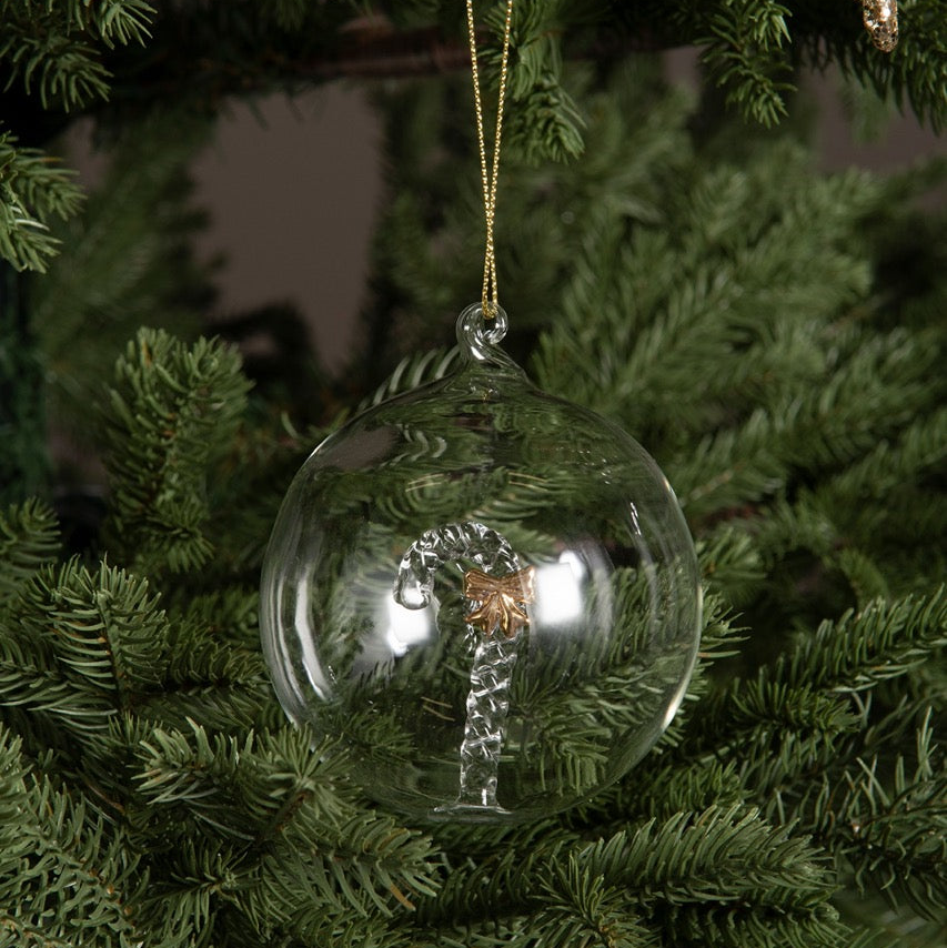 Tämän kirkkaan lasista tehdyn joulupallon sisällä on siro kolmiulotteinen jouluinen yllätys; lasinen kultaisella tähdellä kruunattu kuusi tai rusetilla koristeltu karkkikeppi. Näillä koristeilla tuot kuuseen tai muuhun joulusomistukseen ripauksen hienostunutta tunnelmaa.