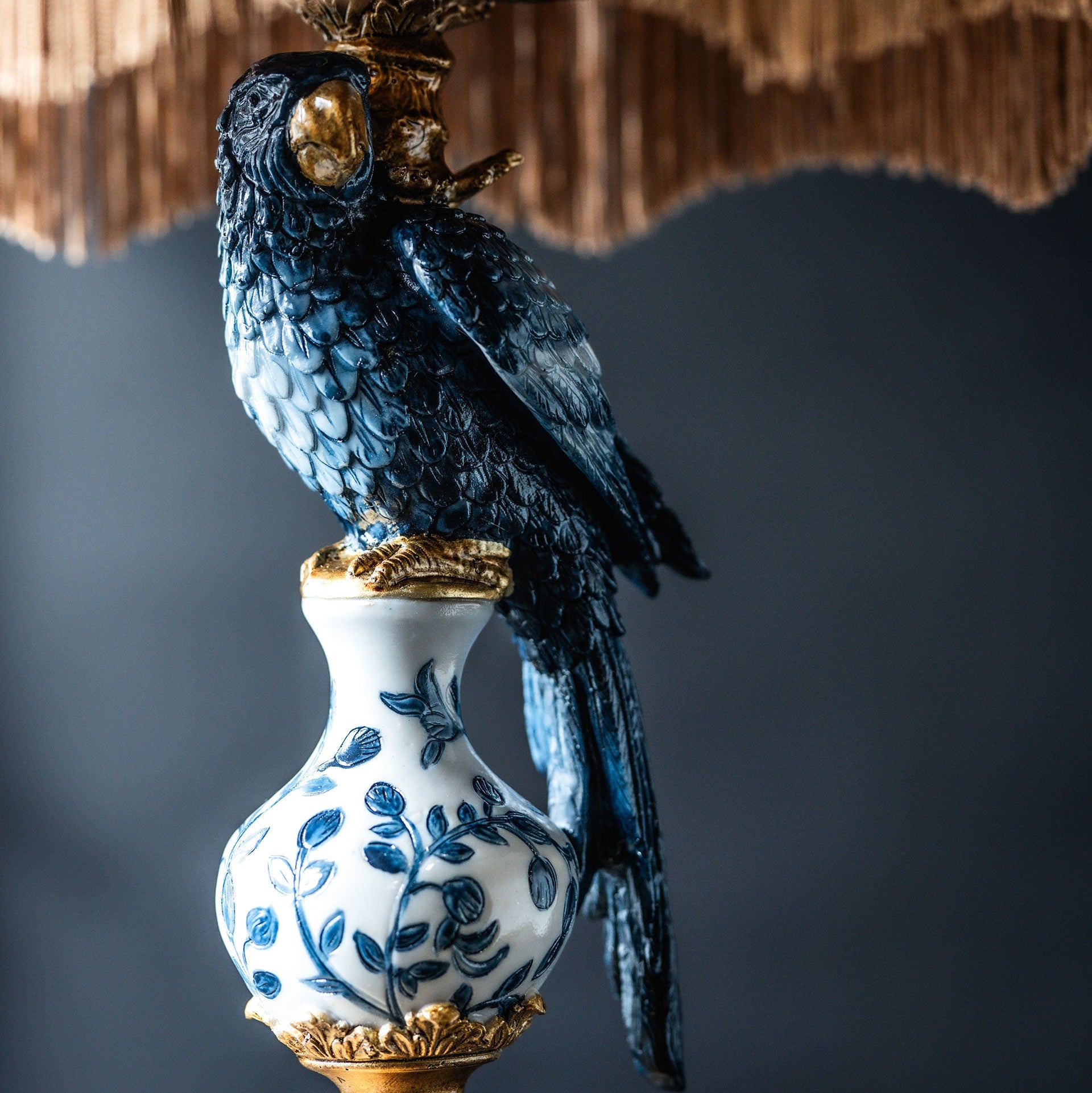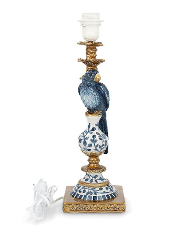 Sini-valkoista lampunjalkaa koristaa sininen papukaija sekä kultaiset yksityiskohdat. Leikkisä ja näyttävä lampunjalka on takuuvarma katseenvangitsija.