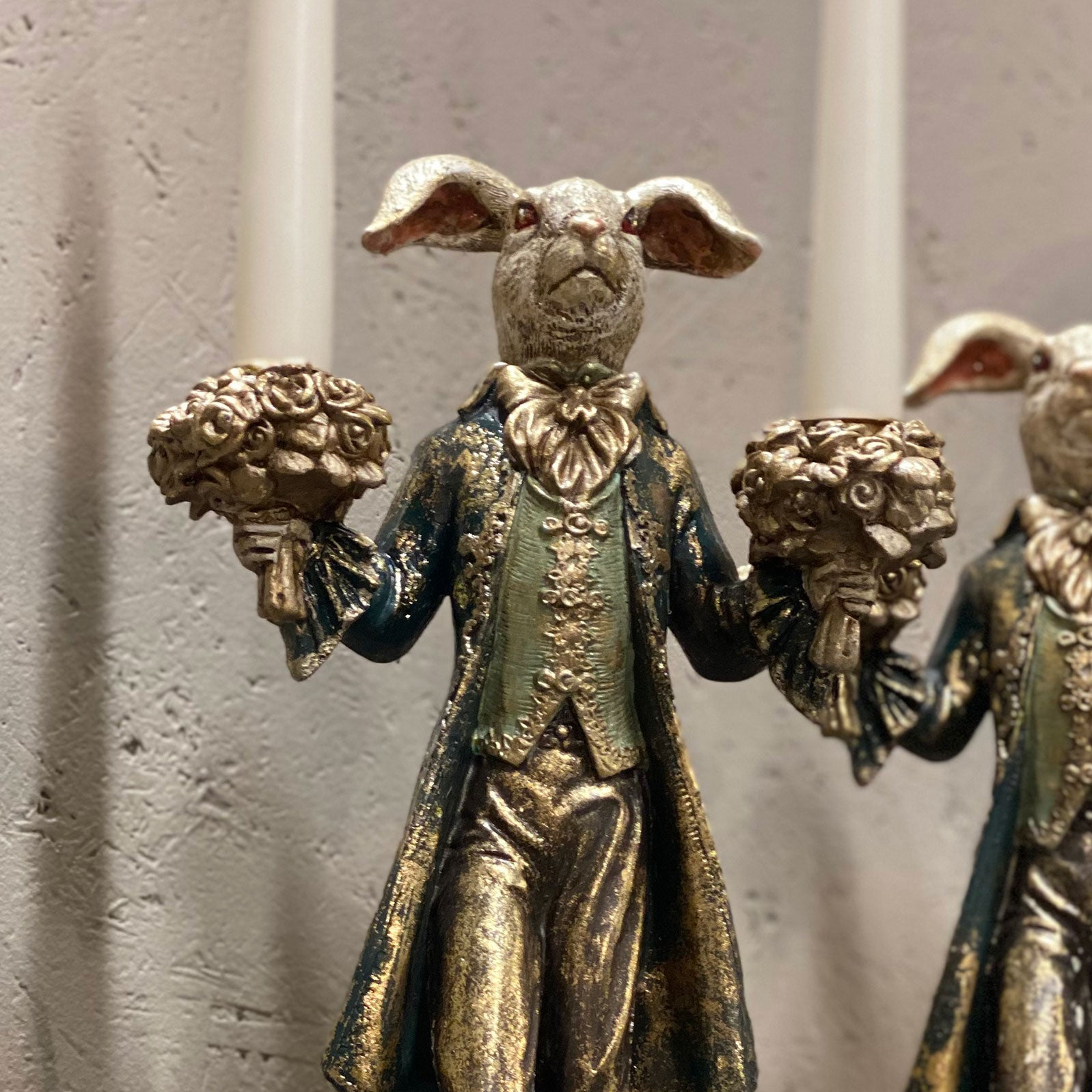 Arvokkaasti tummanvihreään juhlapukuunsa somistautunut kaniherra kantaa molemmissa käsissään kukkakimppua. Kukkakimppujen keskellä on kynttiläkupit, joihin sopii Ø2cm kruunu- tai lampettikynttilä. Leikkisä kultavärjätty kynttelikkö sopii sisustukseen kaikkina vuodenaikoina. Yhdistele sisustukseesi muiden sarjan koristeiden kanssa.