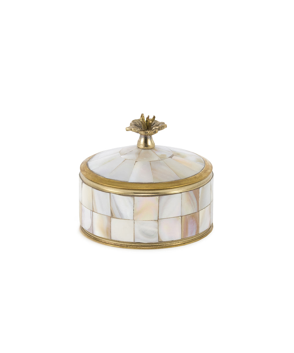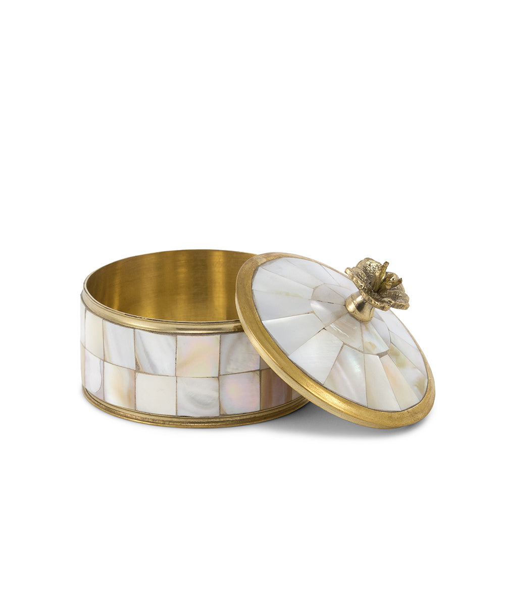 Sirkusteltasta muotokielensä lainaava Maisie-säilytysrasia yhdistää lumoavasti eleganssin ja käytännöllisyyden. Tämä Intiassa käsityönä valmistettu uniikki säilytysrasia on huolella tehty messingistä ja aidosta simpukankuoresta, jotka luovat kauniin harmonisen yhdistelmän tekstuureja ja sävyjä. Rasian kannessa on kaunis messinkinen kiinanruusukoriste.