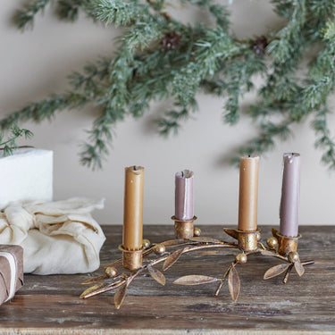 Mattakullan sävyinen kaunis metallinen kynttilänjalka neljälle kynttilälle esittää marjapensaan oksaa.