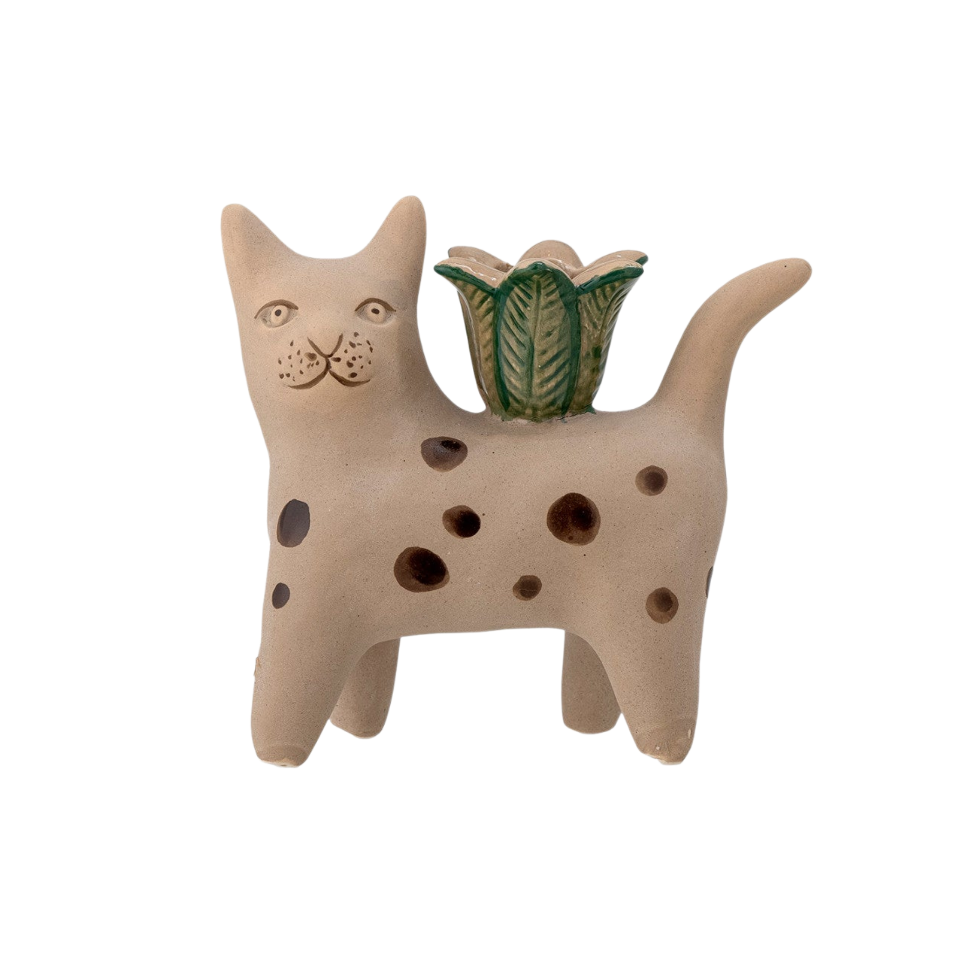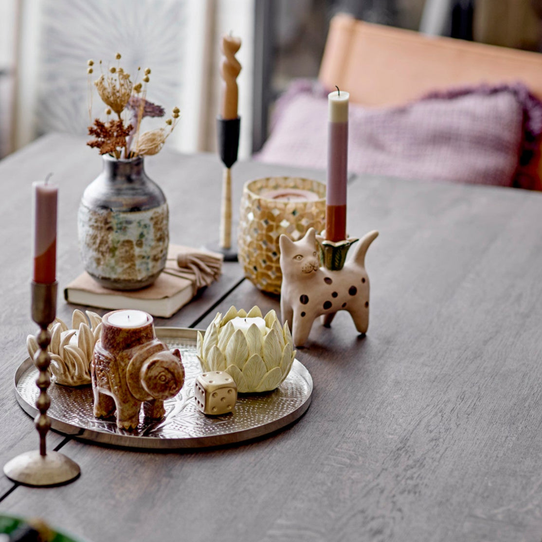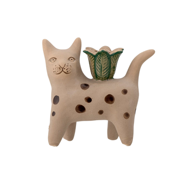 Leikkisä keraaminen kynttilänjalka, joka esittää raidallista ruskeaa kissaa, on ihastuttava väripilkku ja hyvän mielen pöytäkoriste vaikka ilman kynttilä.