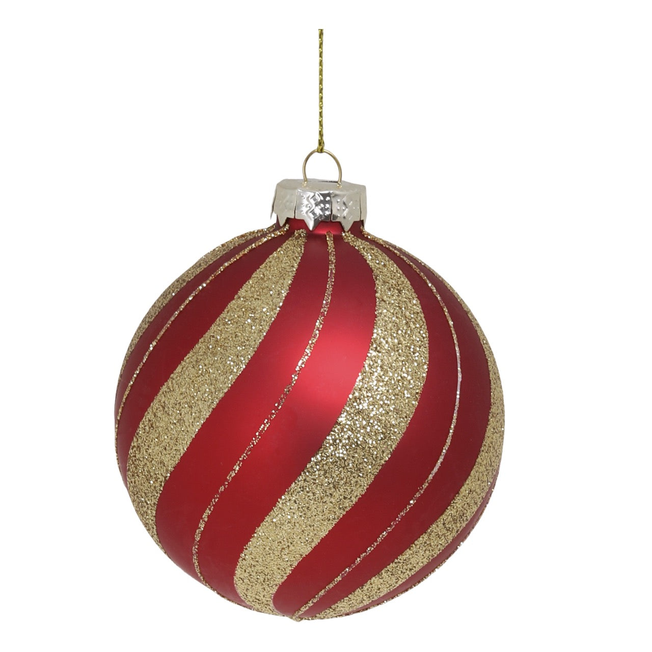 Tätä iloista joulunpunaista lasista joulupalloa rytmittää kierteiset kullanhohtoiset raidat. Kuviointi luo leikkisää joulutunnelmaa. Se on oivallinen koriste myös jouluasetelmiin tai ikkunankoristeeksi.