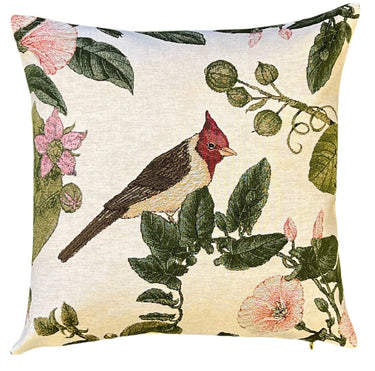 Laadukkaassa beigen sävyisessä jacquard-kudotussa tyynynpäällisessä on kuvattu punakardinaali puun oksalla.