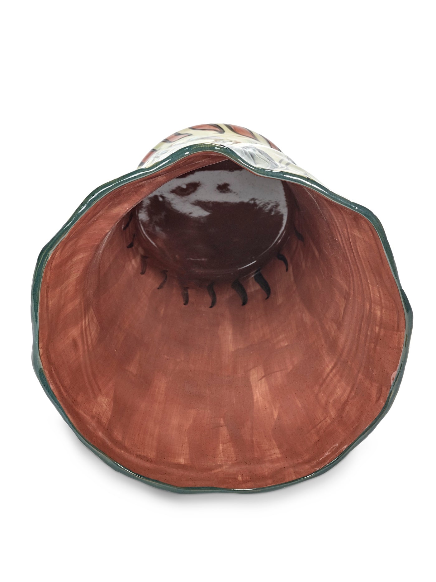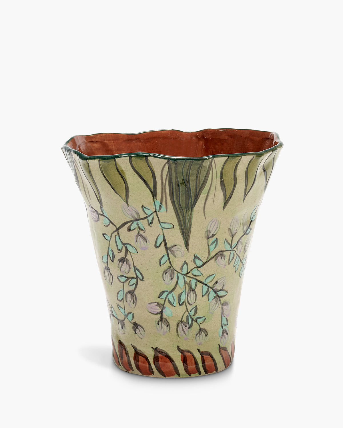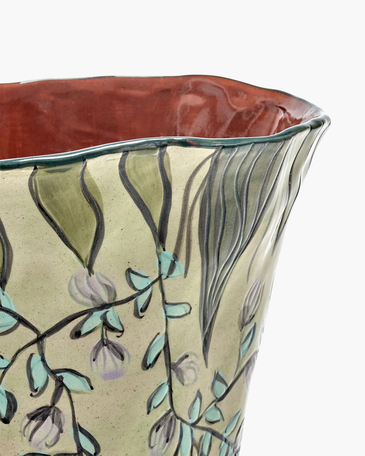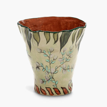 Vaalea, hieman patinoitu keramiikkapinta on koristeltu käsin maalatulla oksa- ja lehtikuviolla, jossa pehmeät vihreän ja hillityn violetin sävyt tuovat maljakkoon herkkyyttä. Sisäpinnan lämmin terrakotan sävy ja yläreunan tumma vihreä reunus viimeistelevät kokonaisuuden.